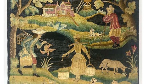CAMBRIDGE, MASS. — An Eighteenth Century needlework picture that showed three figures in a landscape on black fabric, and which had once been in the Ohio residence of GW “Bill” Samaha, was the star...