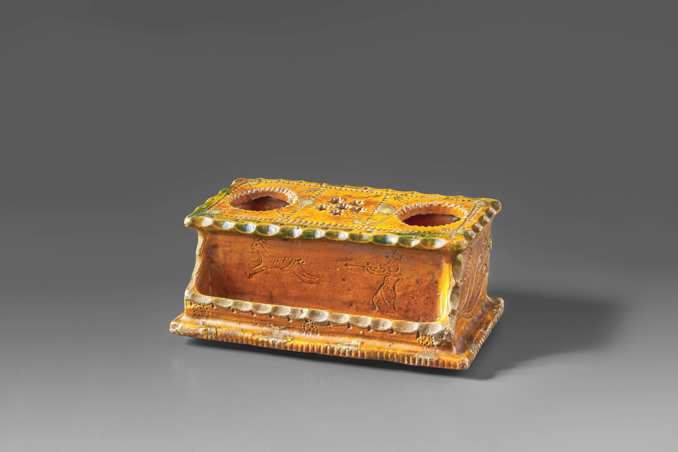 Inkstand for Jonas Haring, attributed to Frederick Pflüger, Hoppenville, Montgomery County, Penn., 1853, lead-glazed earthenware, 2¾ inches (height) by 6¾ inches (width). Collection of Robert and Katharine Booth. Michael E. Myers photo. This inkstand was previously attributed to David and Jared Haring.
