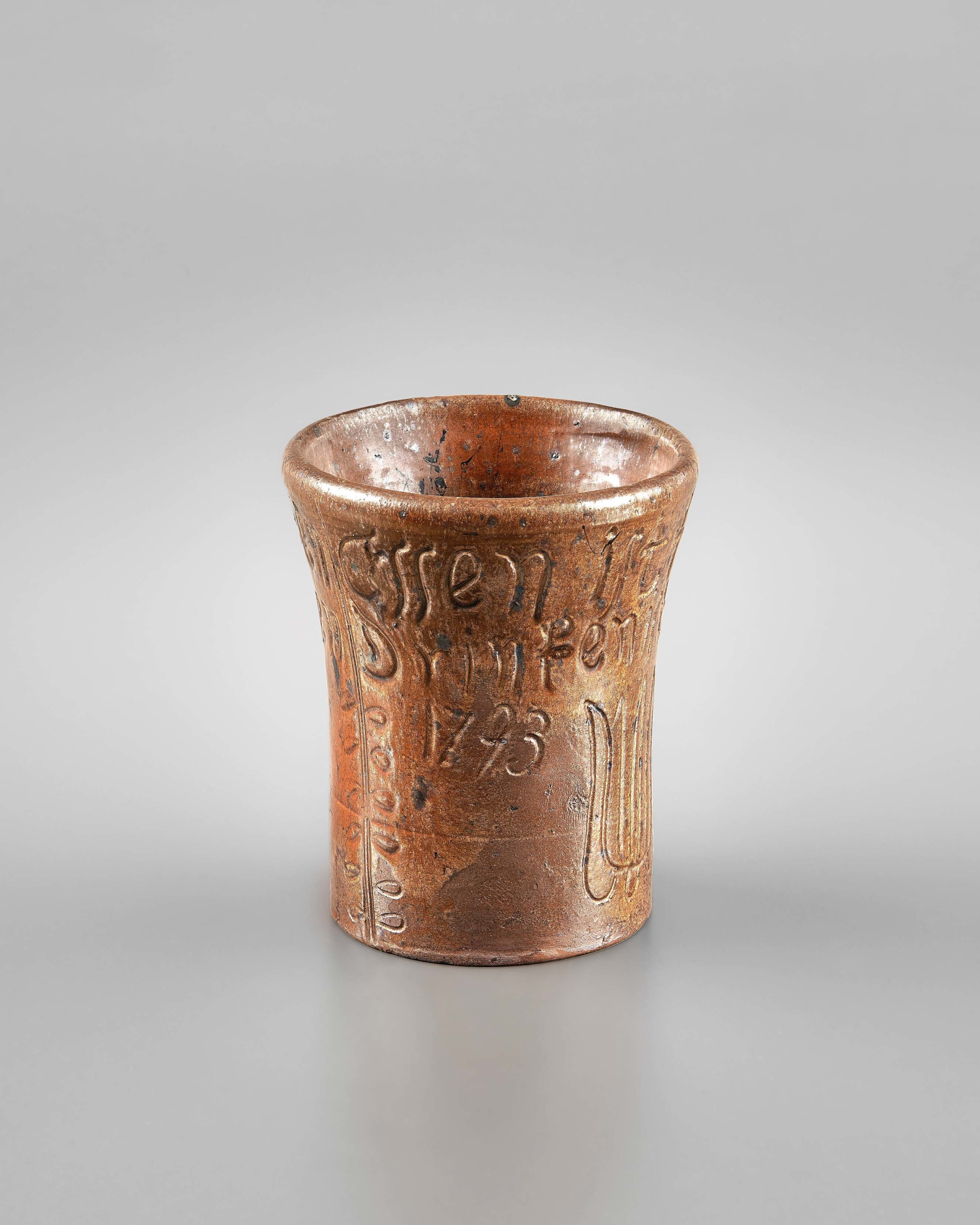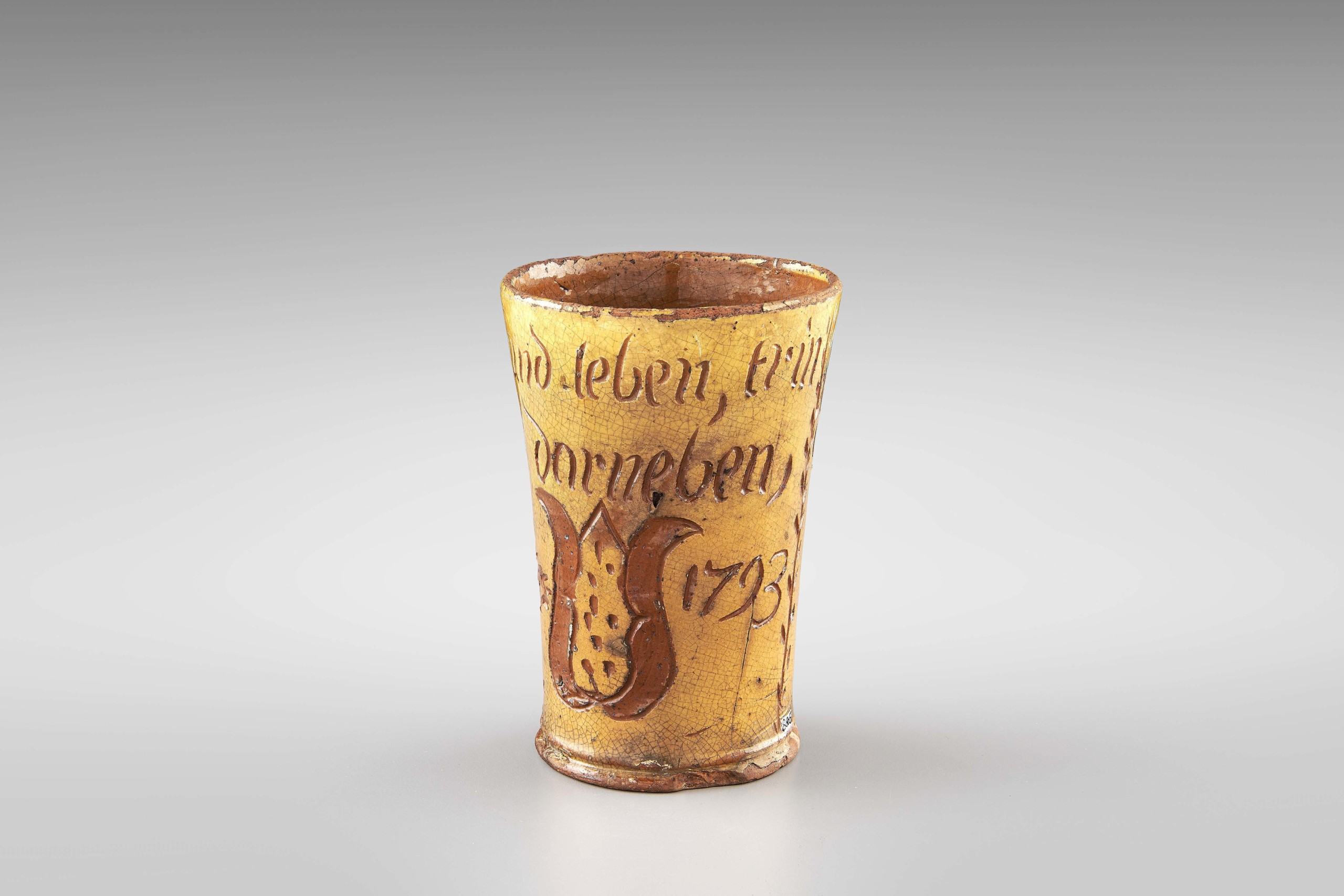 Drinking cup, southeastern Pennsylvania, 1793, lead-glazed earthenware, 5⅛ inches (height), 3¾ inches (diameter). Mercer Museum 00886. Michael E. Myers photo. Inscribed (translation): “Eating comes before love and life; drinking is also good alongside it.”