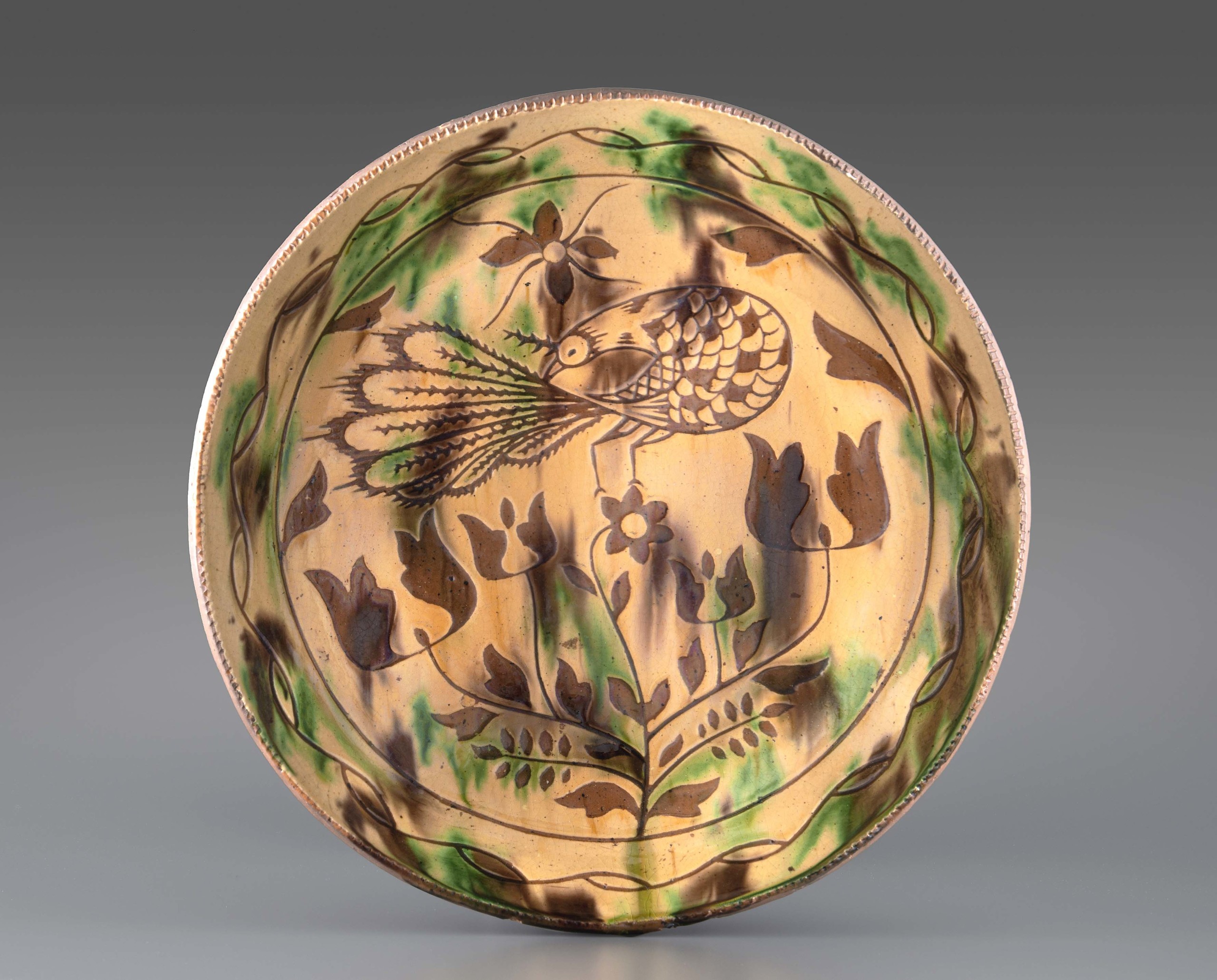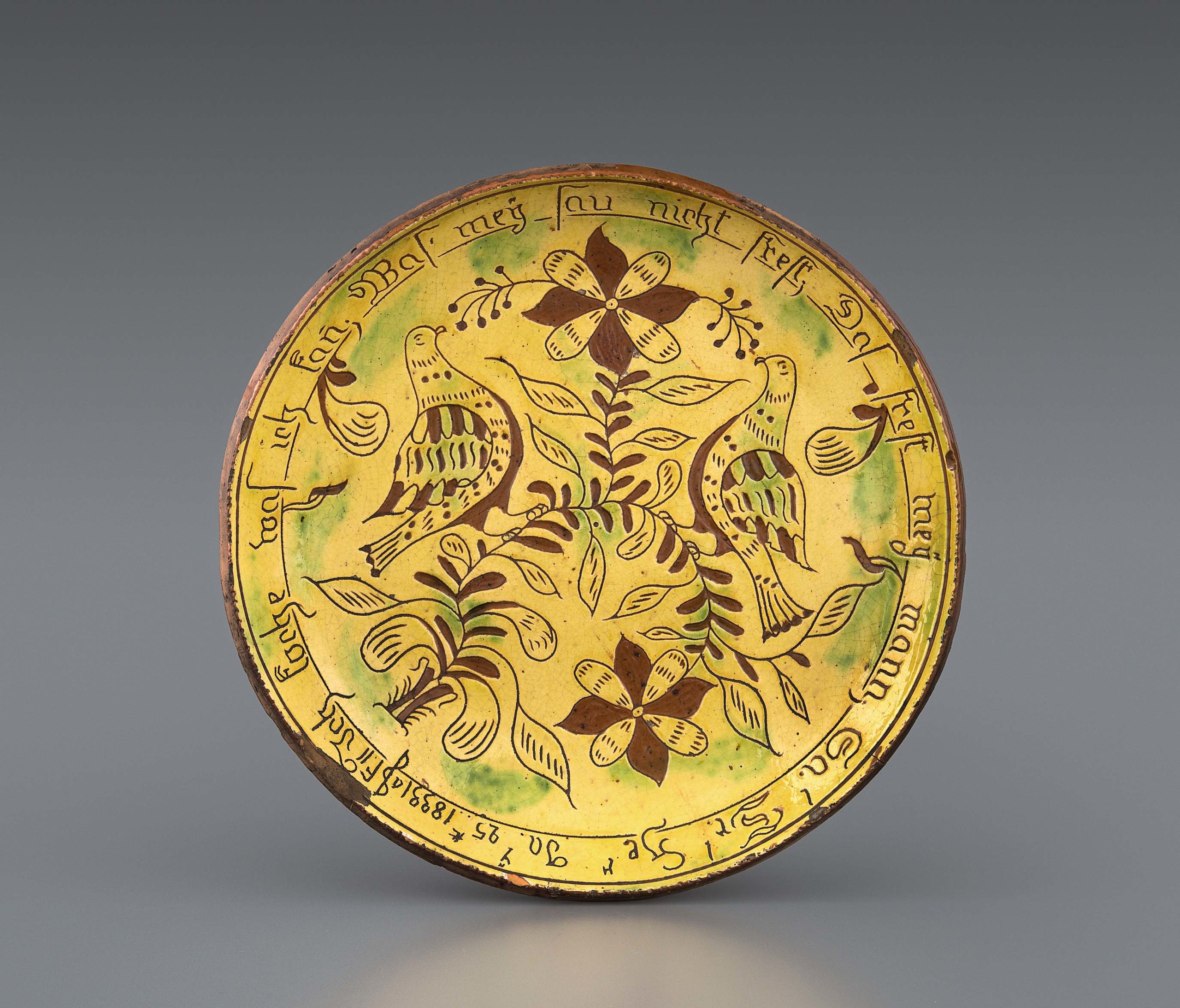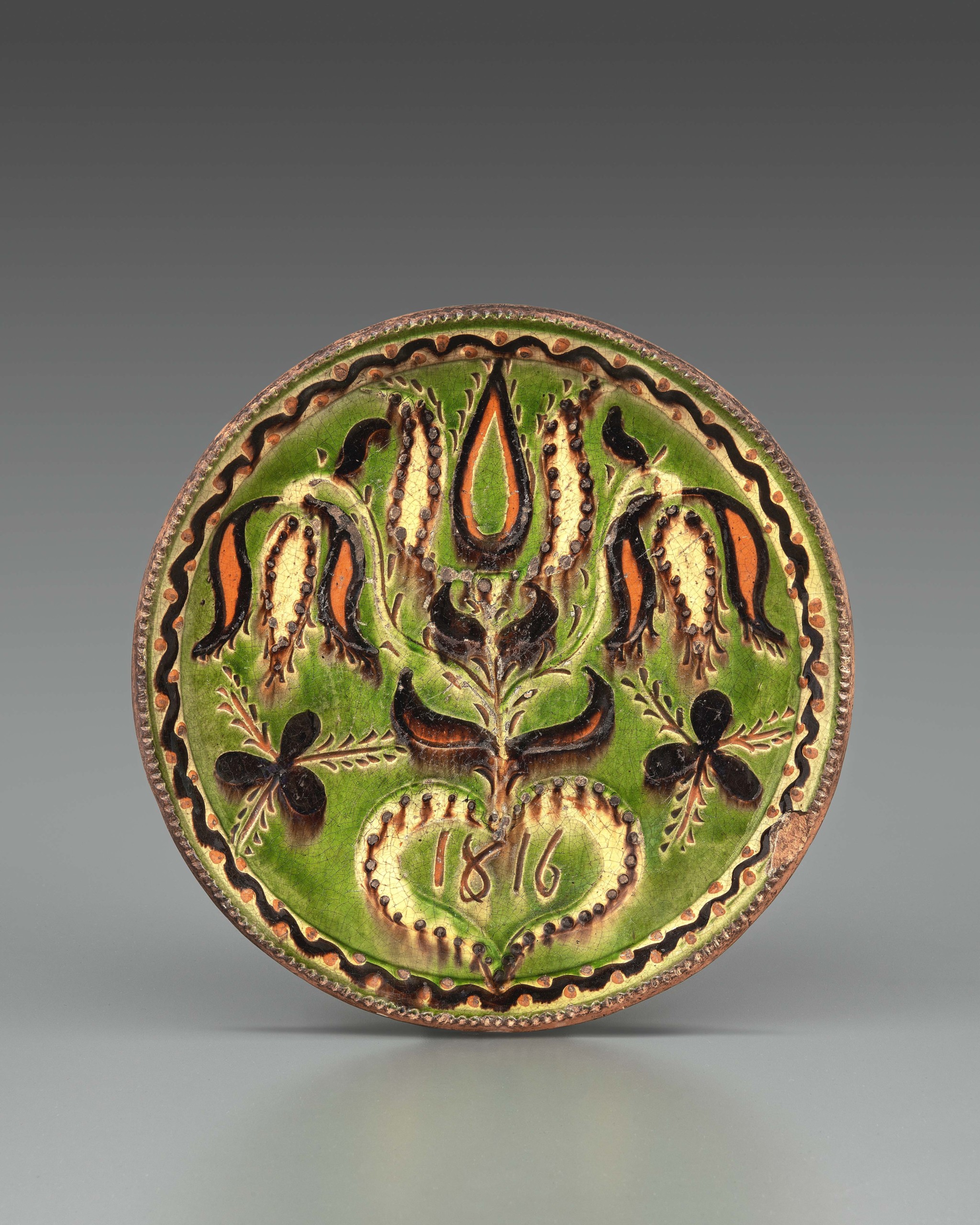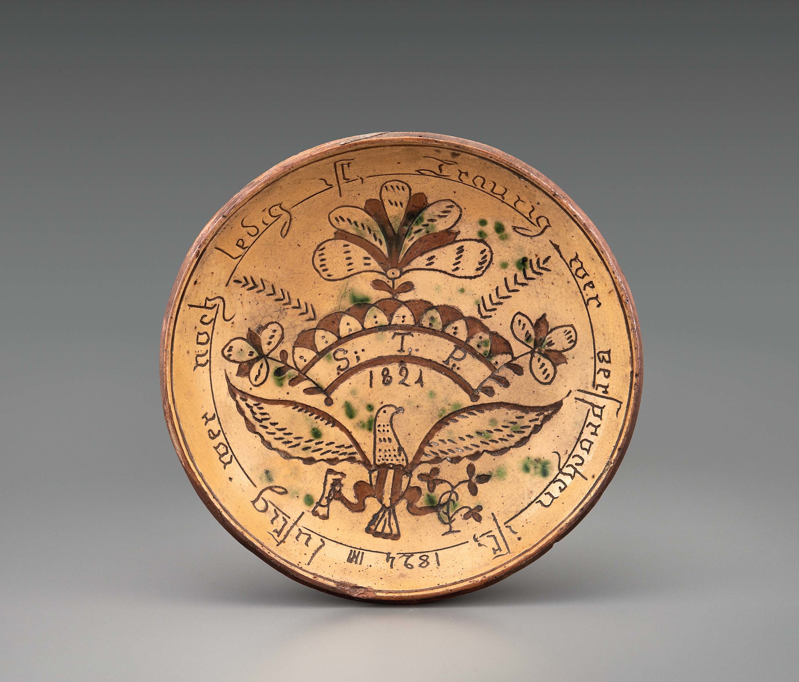 Dish attributed to the Eight-Pointed-Star Artist (formerly Solomon Grim), probably Northumberland or Union County, Penn., 1816, lead-glazed earthenware, 9⅝ inches (diameter). Franklin & Marshall College and the Phillips Museum of Art Collection, Lancaster, Penn., 5122. Michael E. Myers photo.