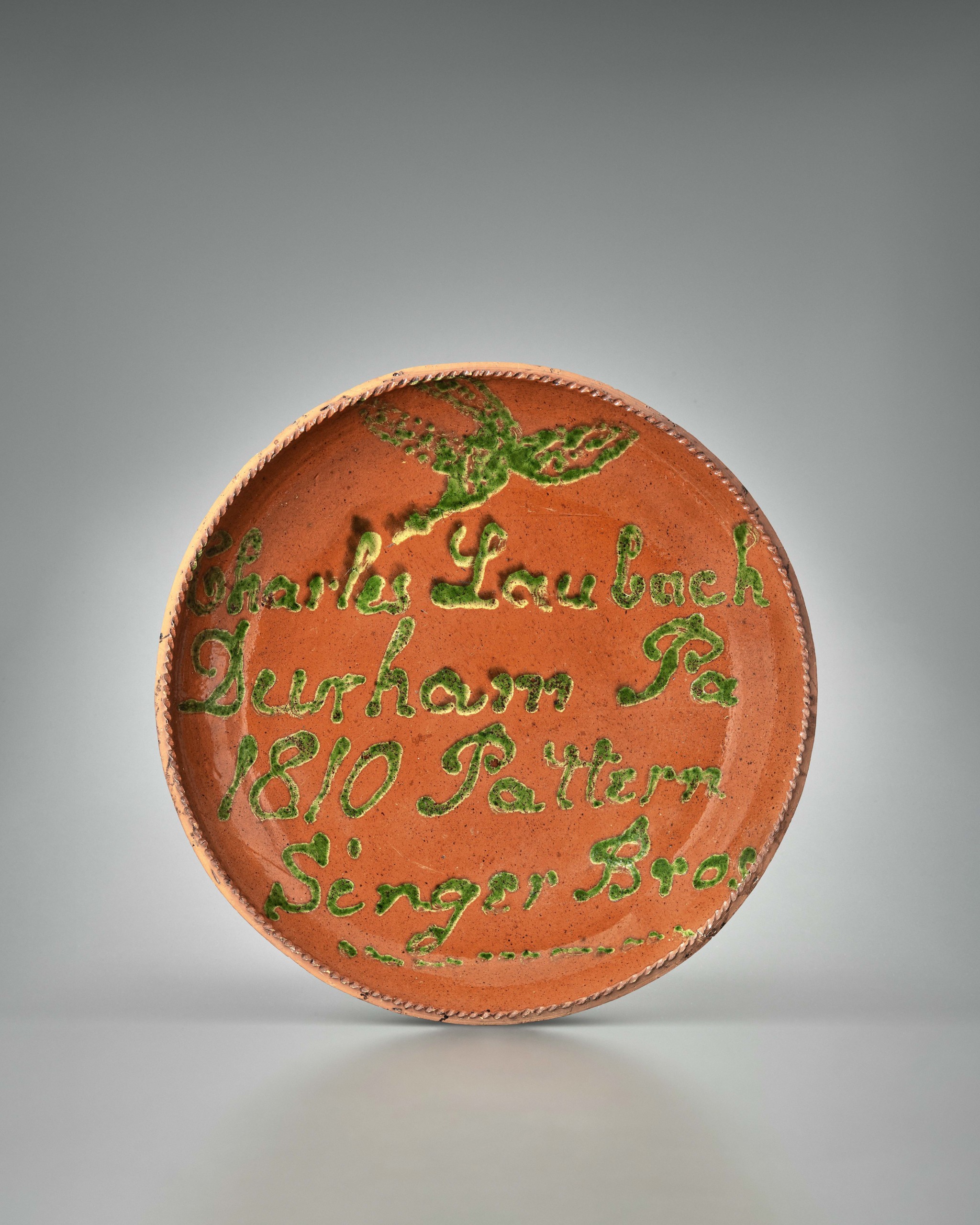 The work of Neis and David Spinner are also featured in the exhibit; they lived on the border of Bucks and Montgomery Counties and are best known for making sgraffito plates featuring men on horseback and other Revolutionary War-inspired imagery. Potter Samuel Troxel of Upper Hanover Township, Montgomery County, is also featured, with a focus on his politically-inspired redware featuring the Great Seal of the United States.