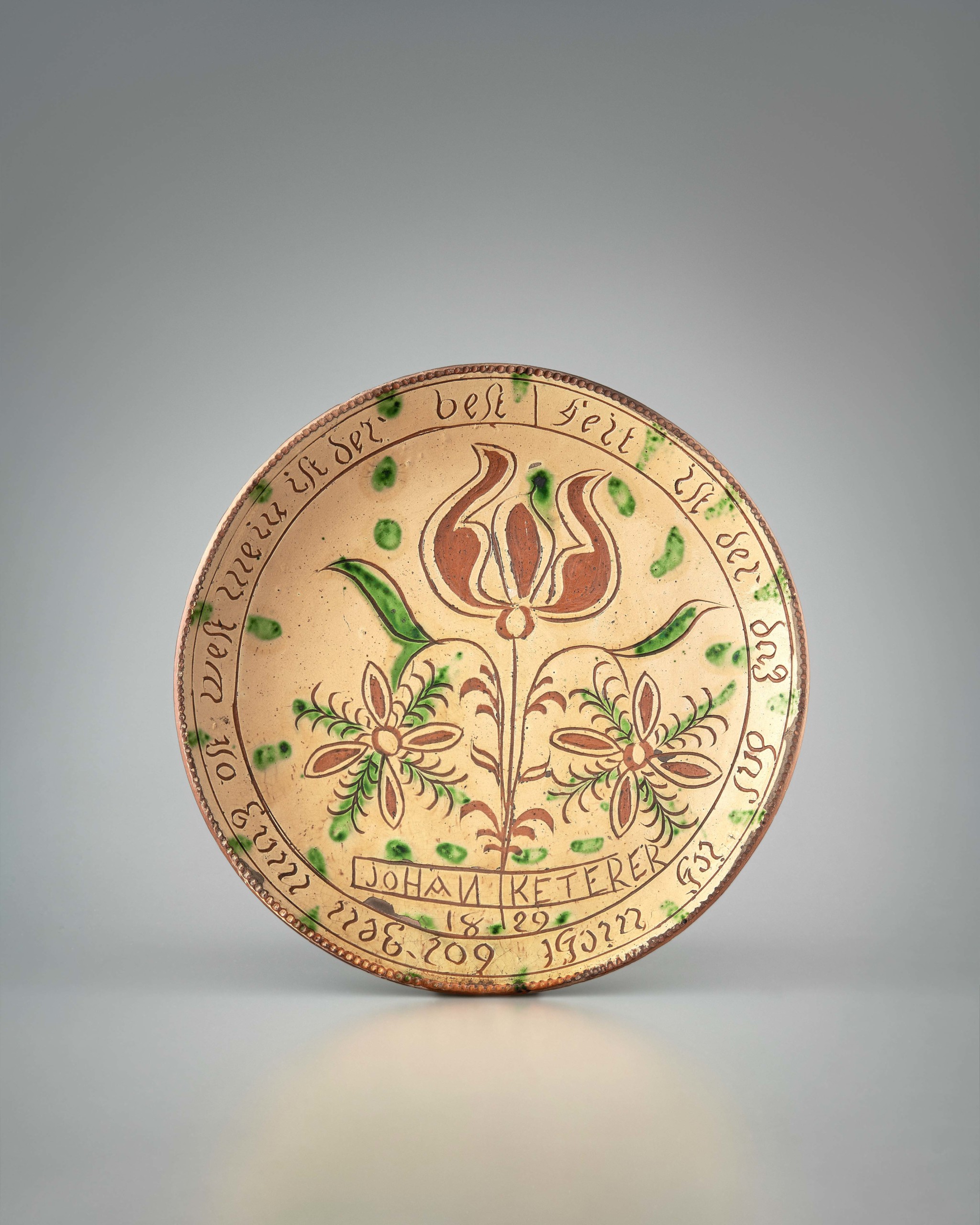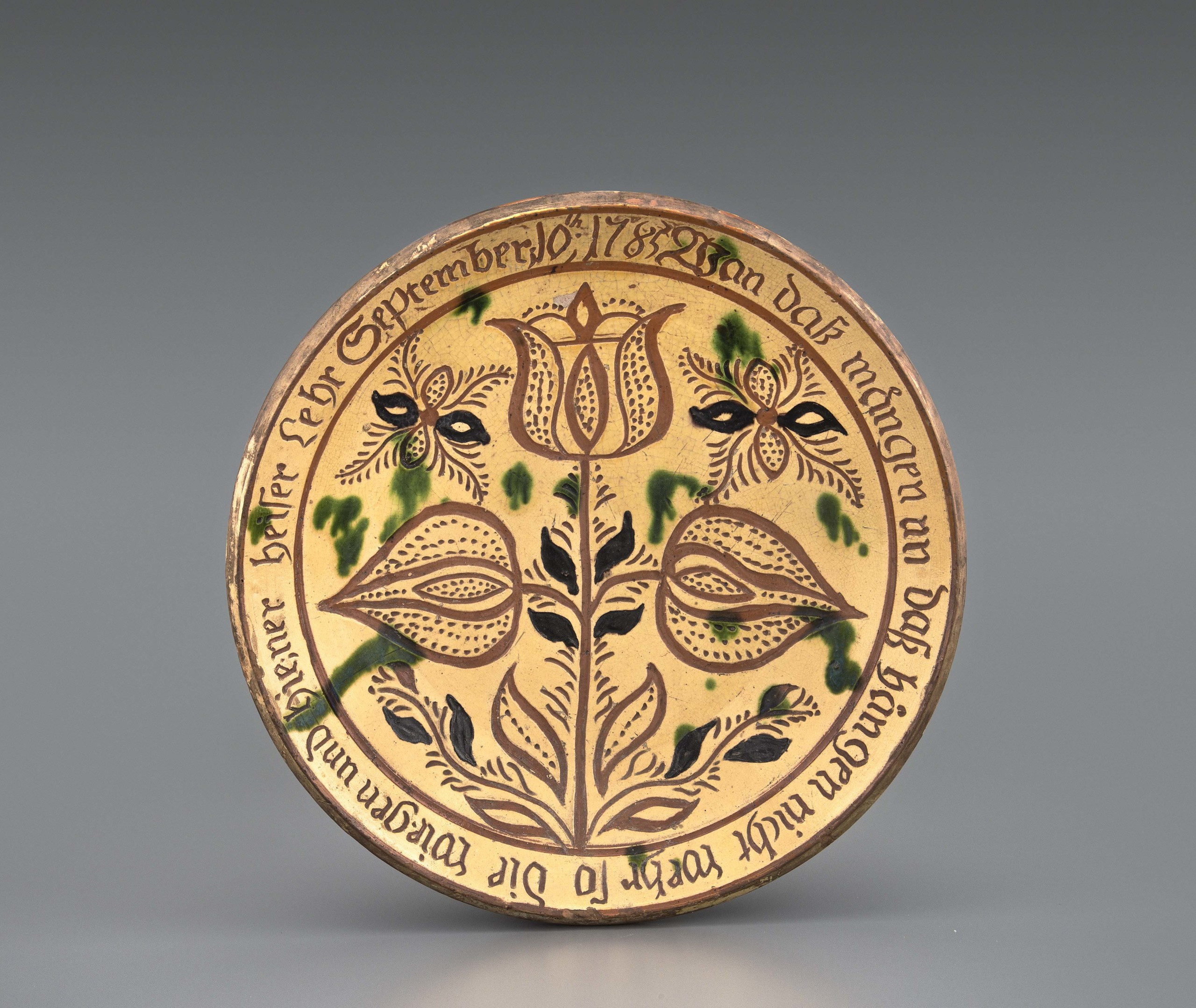 Plate attributed to Georg Hubener, Upper Hanover Township, Montgomery County, Penn., 1785, 12¼ inches (diameter). Collection of Robert and Katharine Booth. Gavin Ashworth photo.