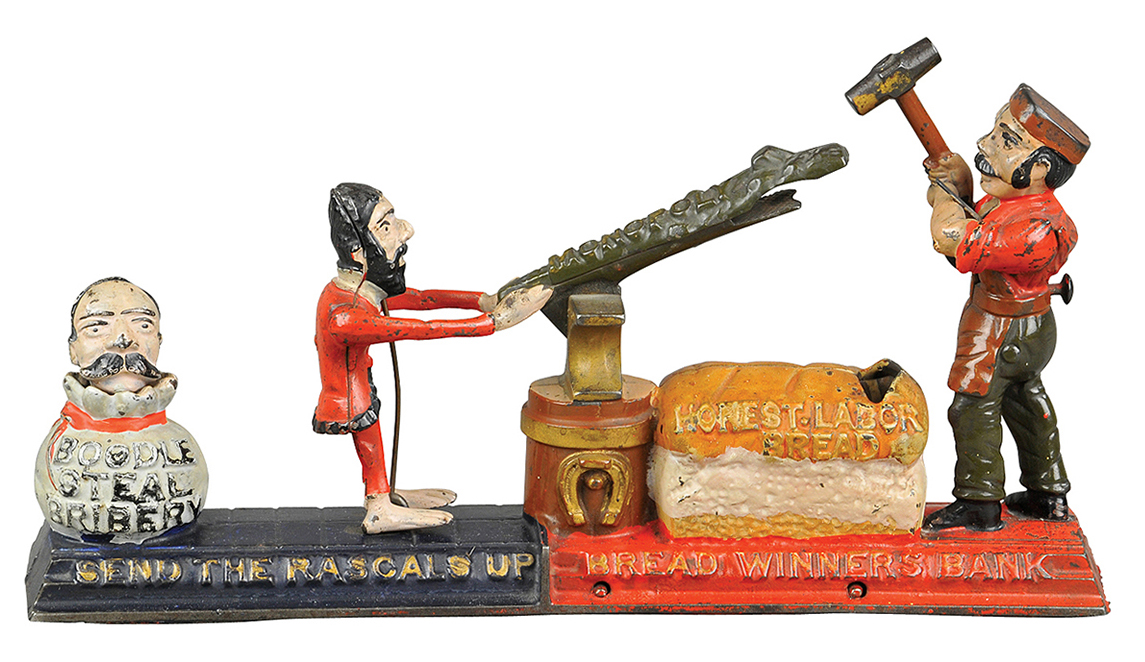 J.&E. Stevens Bread Winners cast iron mechanical bank, circa 1886, provenance: Ferdinand Weider collection ($60/75,000).