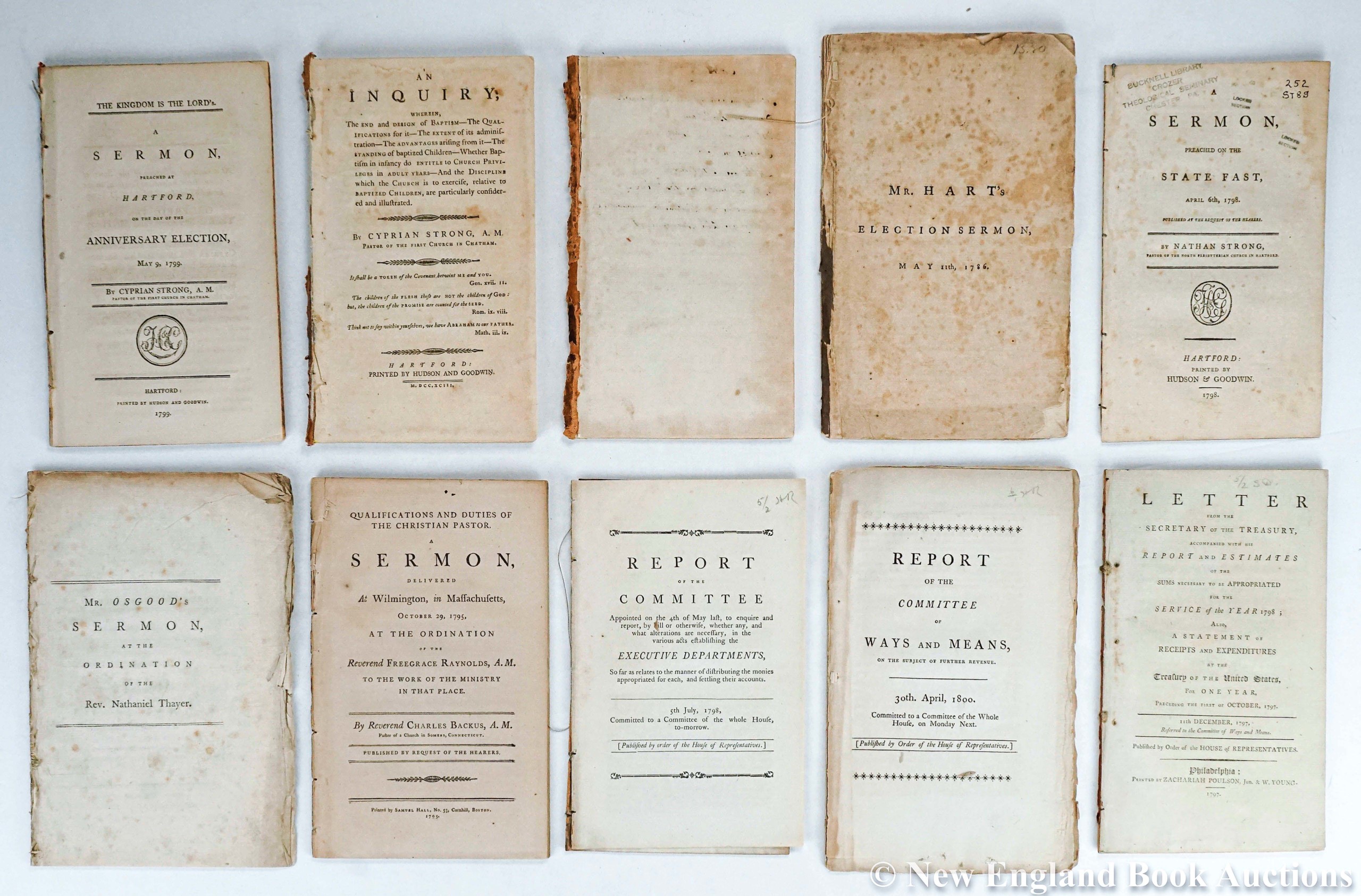 Americana collectors also took interest in another collection of pamphlets, though these, which sold together for $780, were not bound together. All dating from the 1790s to 1800, the 29 issues in this lot were in generally sound condition though some had chipped or frayed margins. Notable inclusions in the selection of sermons, reports, letters, messages and dissertations were “A Letter to the Citizens of Pennsylvania…” by George Logan (1800) and John Adams’ “Message from the President…Touching on the Suspension of the Arrete of the French Republic” (1799). Prices quoted include the buyer’s premium as reported by the auction house. For information, www.nebookauctions.com or 413-665-3253.