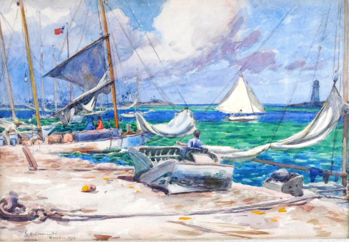 Another American artist, George Henry Clements (1854-1935), was represented by “Nassau,” 1913, a framed watercolor of sailboats at a dock, lighthouse in distance against a cloudy sky. Signed, titled and dated at lower left, matted and framed behind glass, 13½ by 19¾ inches, it took $3,600, more than three times its high estimate.