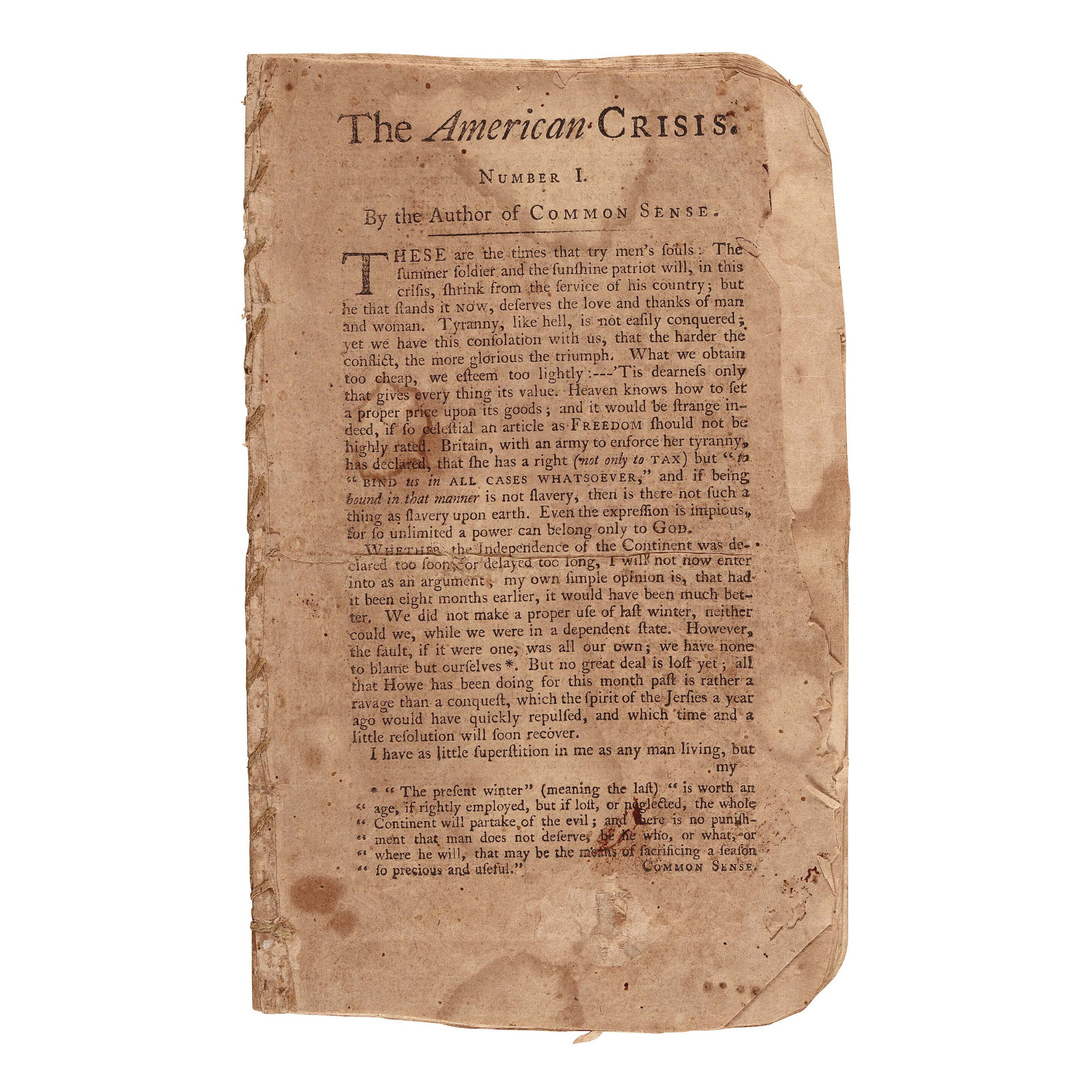 Bound together in octavo format and earning the sale’s highest price of $152,900 were Thomas Paine’s (1737-1809) The American Crisis (Numbers I and II and The Crisis Extraordinary, Philadelphia: Styner and Cist, 1776-77 ($80/120,000).