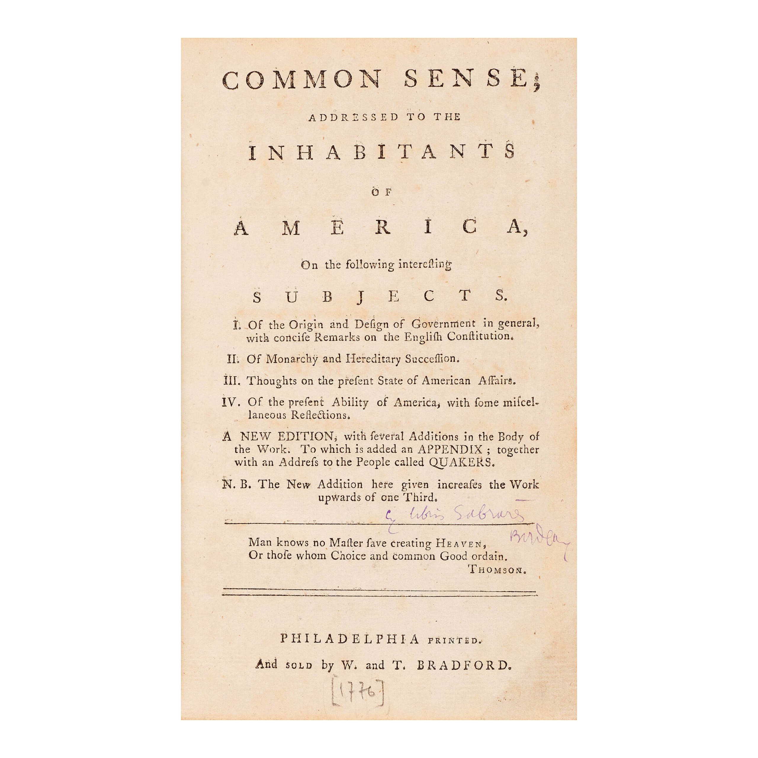 This first expanded edition of Common Sense by Thomas Paine (1737-1809), Philadelphia: [Steiner and Cist for] W. and T. Bradford, 1776, brought $76,700 ($30/50,000).