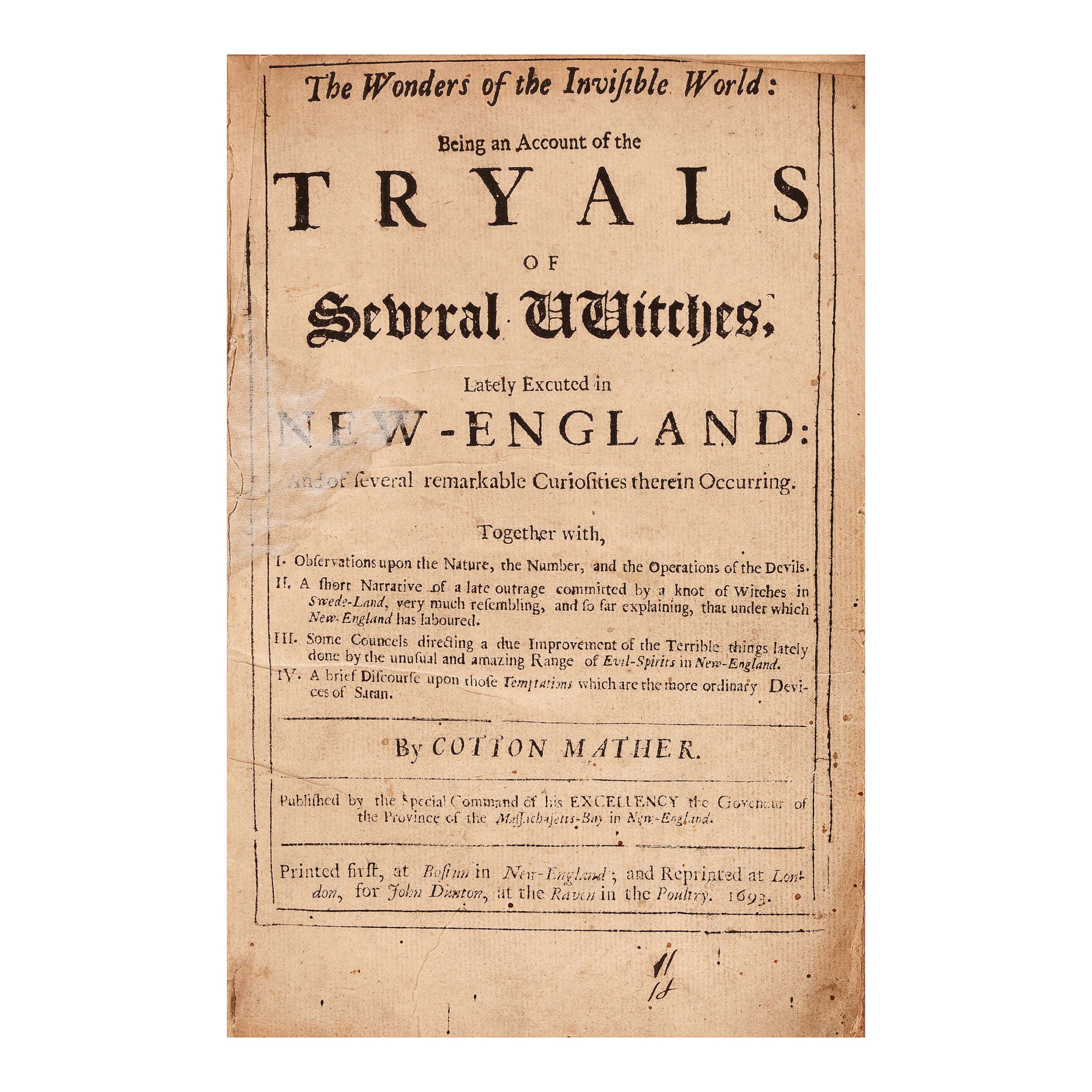 Written by Cotton Mather (1663-1728), this first London edition of The Wonders of the Invisible World…The Tryals of Several Witches…, published by John Dunton, 1693, earned $17,920 ($15/25,000).