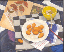 Munroe paints lively still lifes on panel using oil pastel and oil paint. The elements within each still life unite nature with domestic artifact. In “Apples in a White Plate,” fresh apples and dried leaves nestled on a white ceramic plate create a Victorian tone.