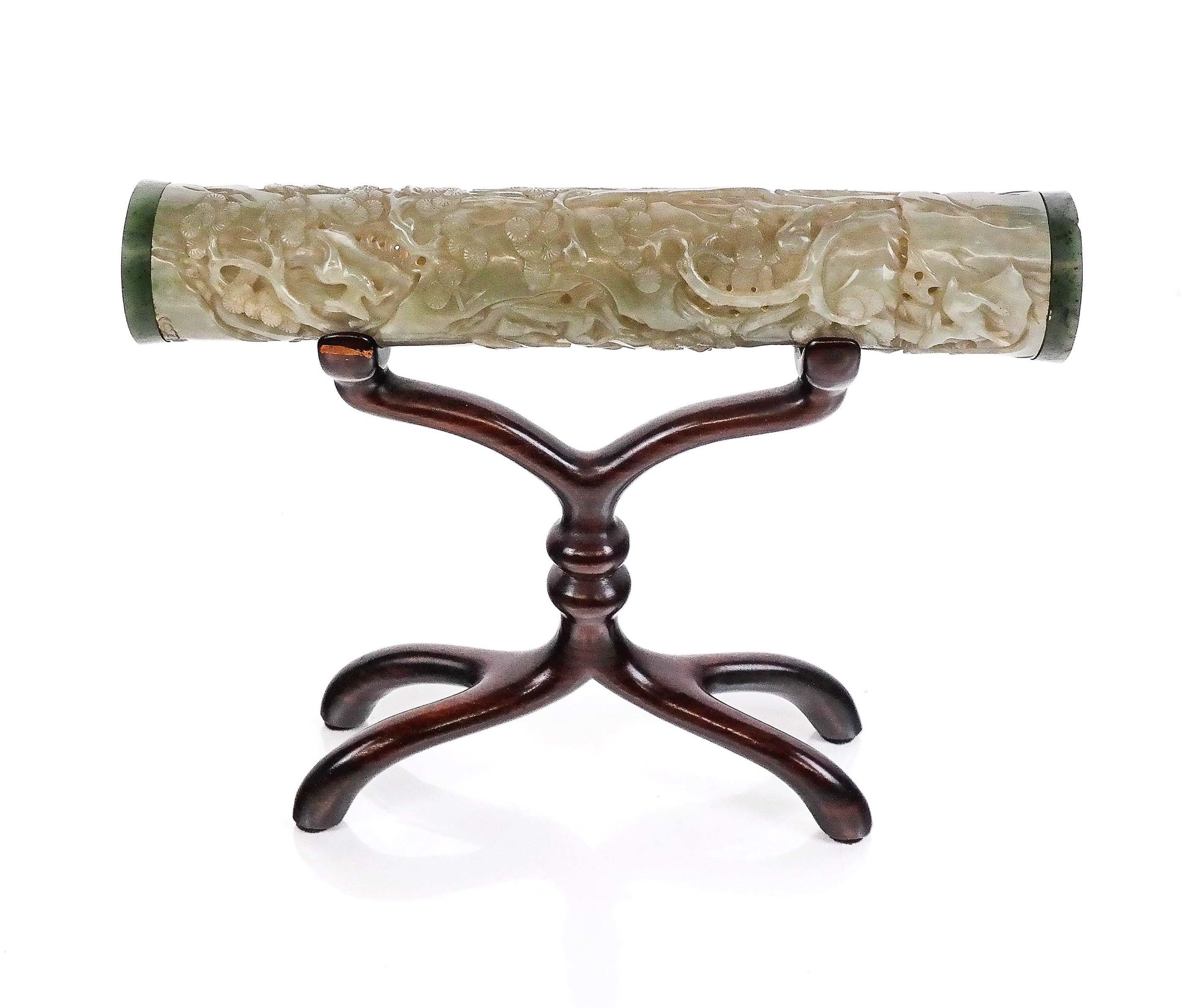 Additional notable items from the Columbia University collection included a Regency era mahogany and specimen marble-top center table with acanthus carved legs ($10,400); an intricately carved circa Nineteenth Century Chinese jade scholar’s object, possibly a scroll tube, with carved foliate, deer and architectural decoration ($9,100); and “Einheit aus drei Gleichen volumen (Entity made up of three identical volumes),” a gilt brass sculpture by Max Bill, signed “Bill 61-63” on the edge of one of the volumes ($7,150).