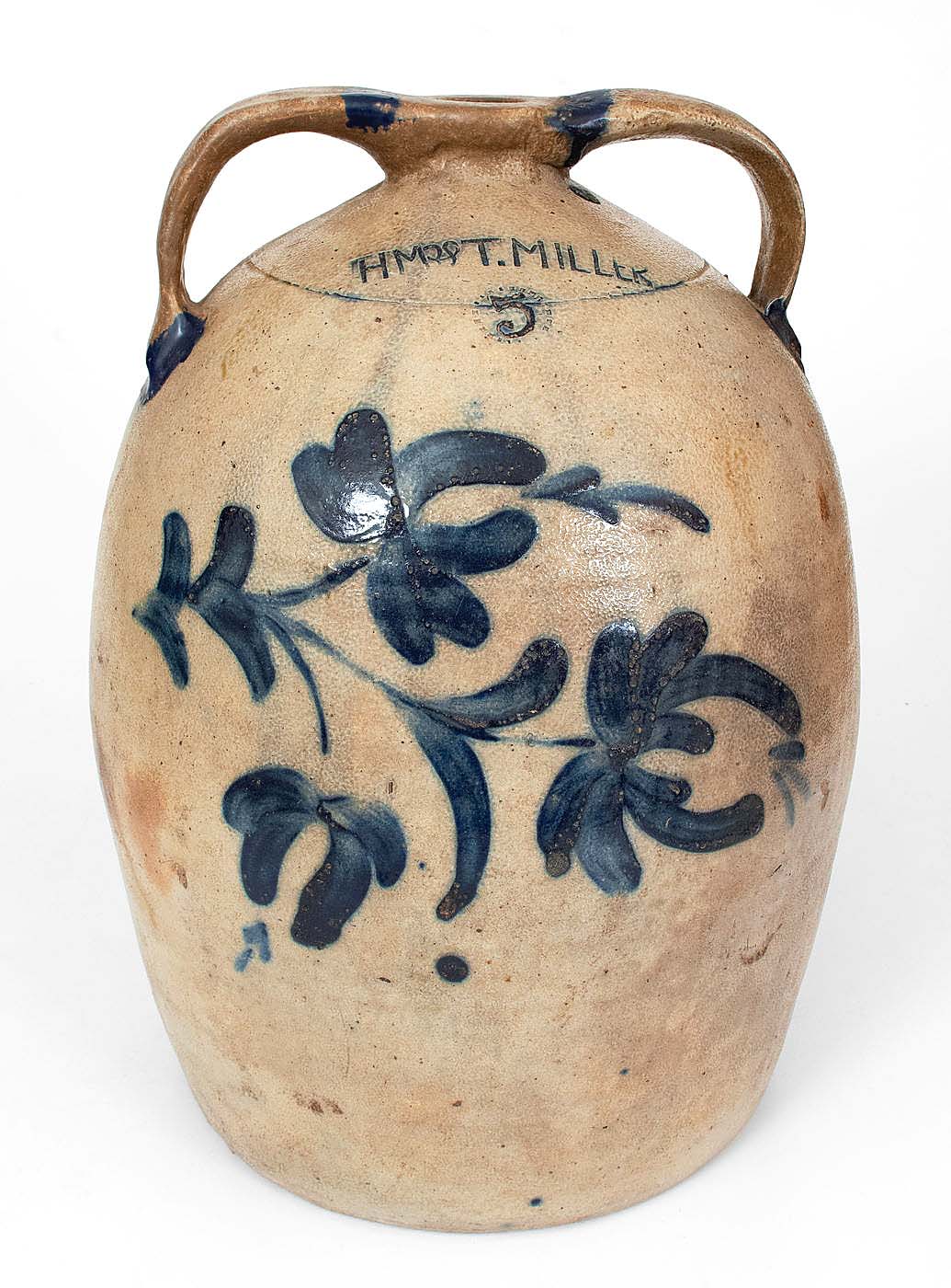 Though it may not have been the earliest mark made by Henry, Michael and Theophilus Miller in Newport, Penn., the “HM&T Miller” mark on a 5-gallon double handled stoneware jug with cobalt floral decoration is the only example Crocker Farm has ever handled. It rose to $11,400, nearly quadrupling its high estimate.