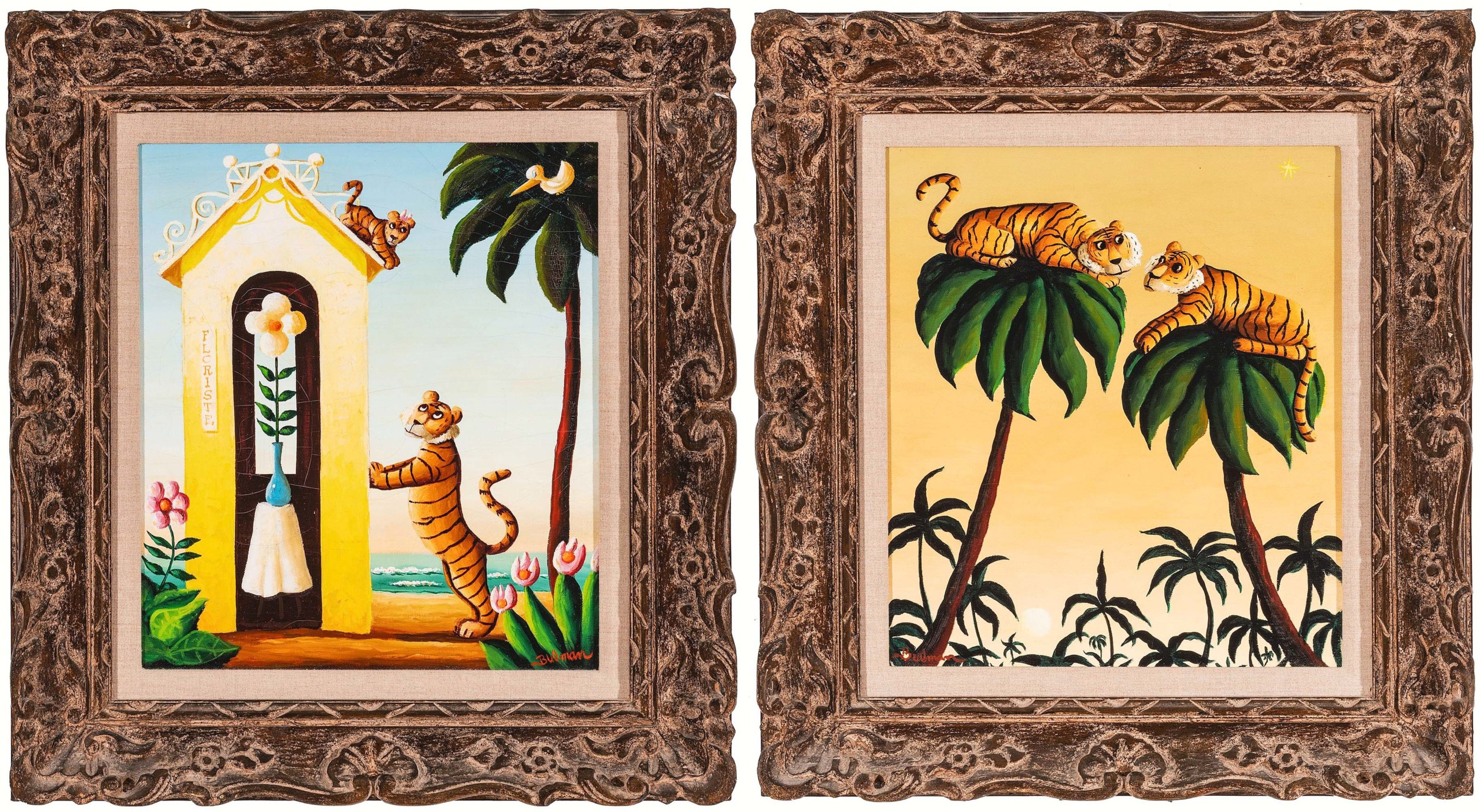 Leading the sale overall was a circa 1975 oil on canvas of a playful tiger cub on a roof, with its mother coaxing it down. Titled “S’il Vous Plait, Mon Chere (Please, My Dear),” Orville Bulman’s colorful scene saw “Lots of spirited bidding on the phone, sales room and online,” according to Beecher. The work had provenance to the collection of Cynthia Newton of Grand Rapids and Traverse City, Mich., and sold to an online bidder based in Alabama for $49,600, almost two and a half times its high estimate. The same buyer also took home Bulman’s “Bonjour?” from the same collection. This work showed two tigers, each atop a palm tree, inquisitively looking into each other’s eyes. Signed and titled to the bottom, as was the first, “Bonjour?” went out at $43,400, also more than double its high estimate.