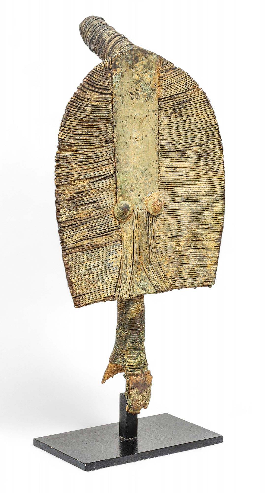 This Mahongwe (Gabon) wood and brass or copper reliquary figure, or Boho Na Bwete, circa late Nineteenth Century, 17½ inches tall on base, brought $46,500 ($10/20,000).