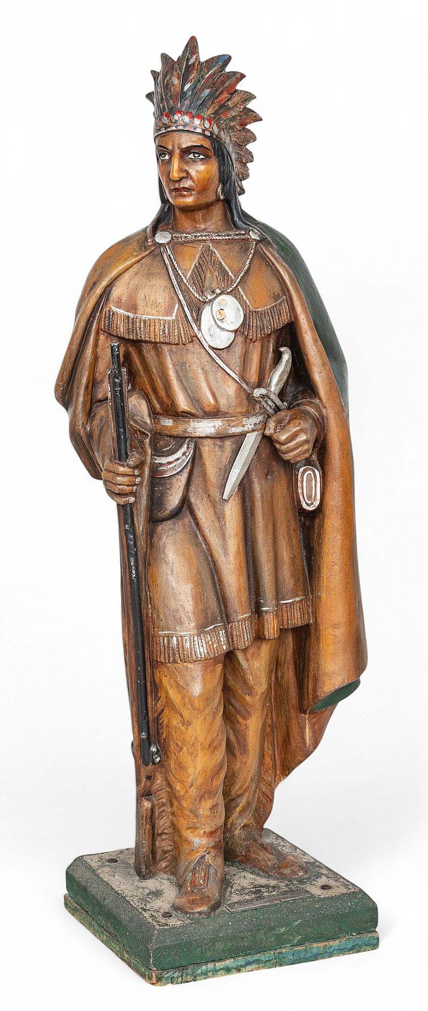 This cast zinc and polychrome “Indian Hunter” tobacconist trade figure by William Demuth & Company (American, 1863-1911), circa 1875, 67½ inches high by 23 inches wide by 18¼ inches deep, finished for $31,000 after “lots of phone and online bidding,” shared Beecher ($15/20,000).