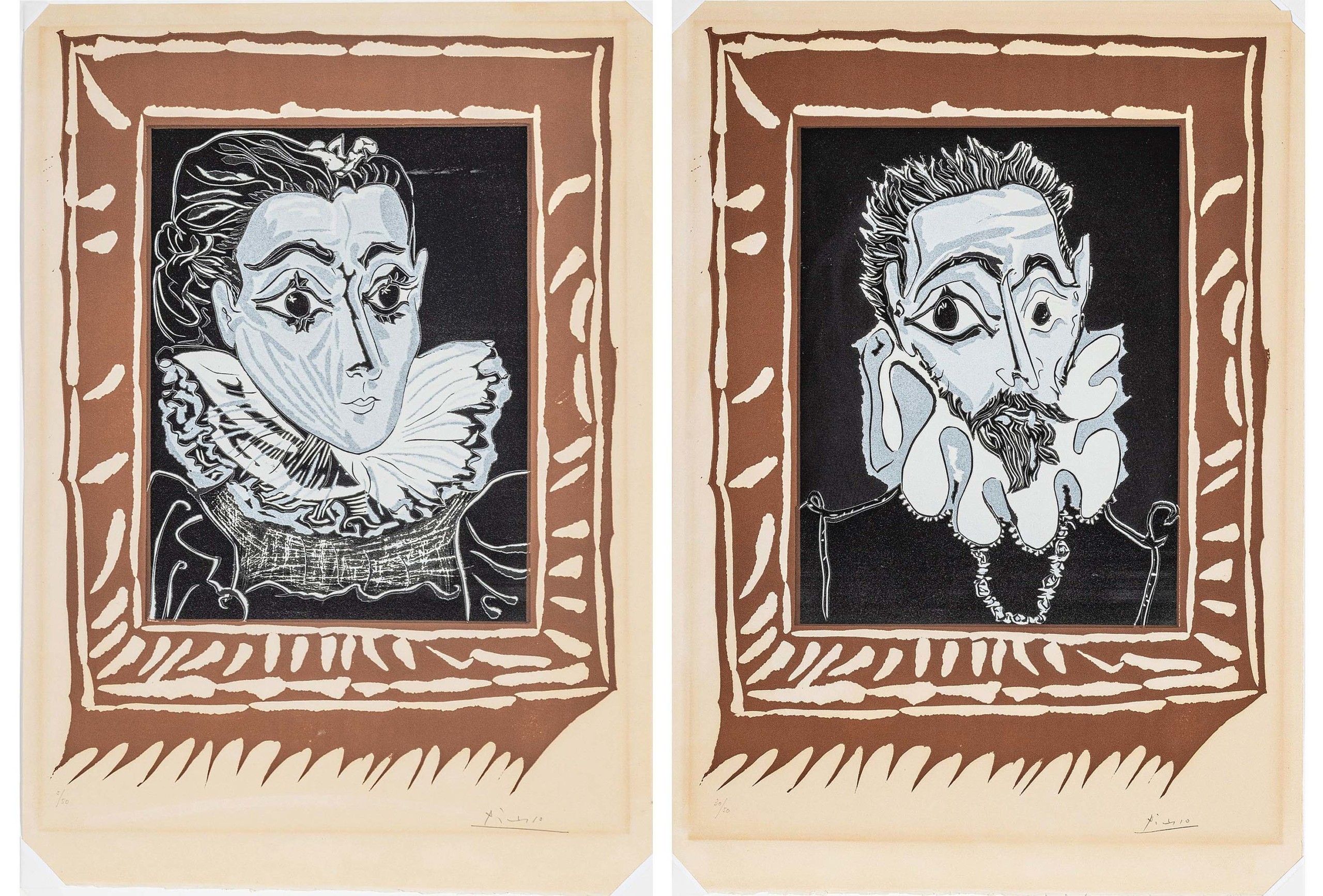 “Portrait De Jacqueline À La Fraise” (left) hung for $43,400 while her companion, “L’homme À La Fraise” (right), brought $24,800 ($20/40,000). Both Pablo Picasso (Spanish, 1881-1973) linoleum cuts printed in colors on wove paper were published in 1963.