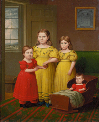 The “Eaton” likeness, circa 1844, offers a quandary. On one hand, the carefully coiffed, well-dressed children directly engage the viewer with their eyes, are illuminated with a strong light from one side, and furnishings are delineated in careful detail †all characteristics of Peckham’s children’s portraits. On the other hand, the creator of this portrait employed more subdued colors and thinner application of paint than normally seen in Peckham’s works. For now, it is “attributed to” Peckham.