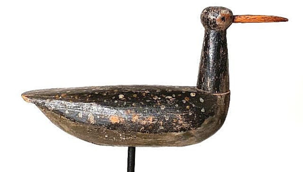 The sale’s top price, $15,990, more than two-and-a-half-times its estimate, was earned by a working decoy, and the second highest price was earned by a miniature mallard hen by Elmer Crowell, which sold for $9,840. There were numerous shore bird decoys and one, attributed to a Cape Cod carver, brought $4,182.