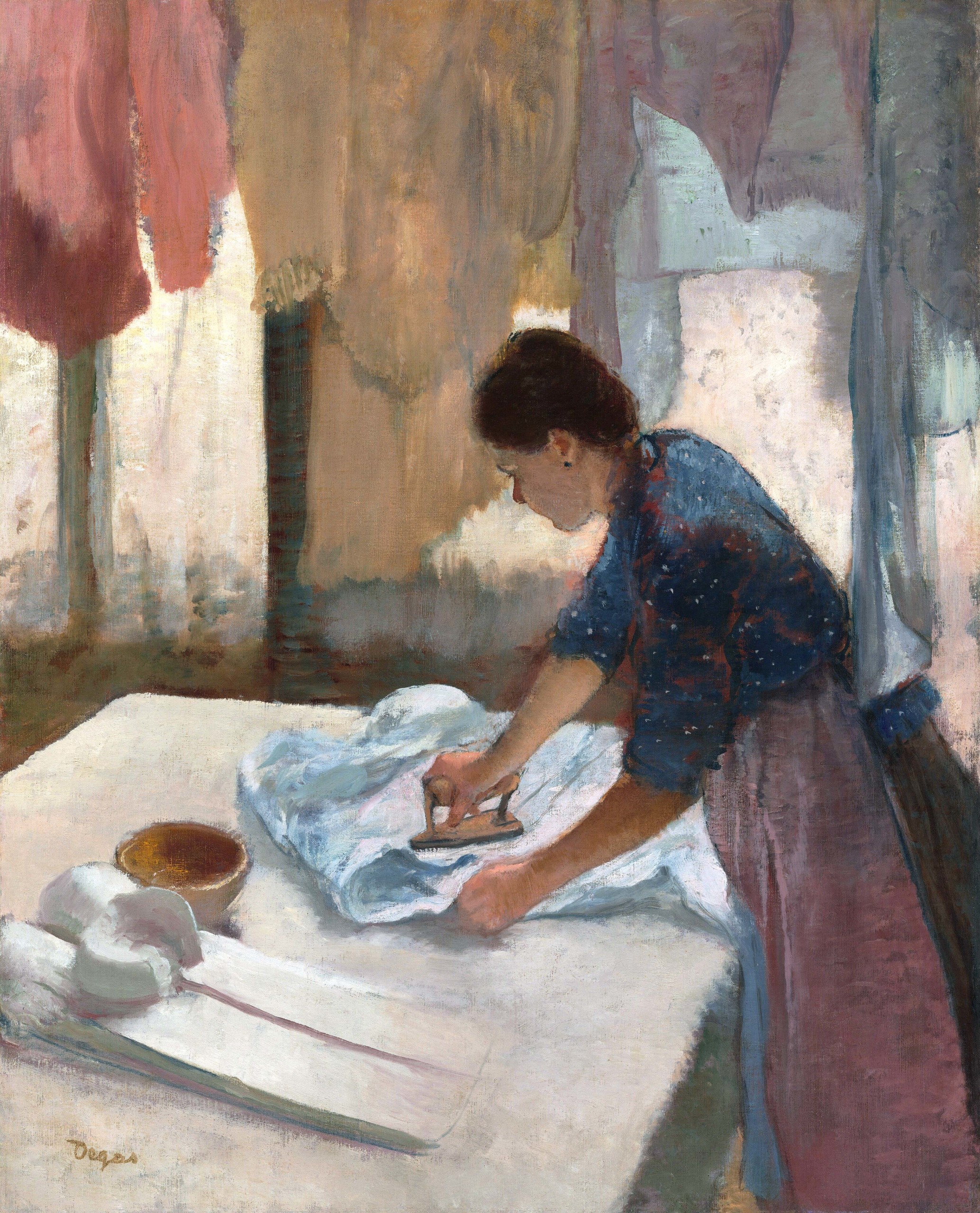Edgar Degas (1834-1917), an Impressionist painter and a dedicated chronicler of modern life in Paris, demonstrated an interest in laundresses as an artistic subject early in his career — before, indeed, he or anyone else identified as an “Impressionist.” “Die Büglerin (The Ironer),” now at the Neue Pinakotek Museum in Munich, made in 1869, shows Degas synthesizing many of the ideas and techniques that would come to define his work. Beyond the feathered brushwork and the interest in interior/exterior lighting — a small opening to the outdoors is visible in the deep background as a trapezoidal shape of white pigment — it conveys an interest in movement that is also evident in his famous paintings of horses and ballerinas, says CMA curator Brittany Salsbury. “We know that he was obsessed with depicting movement and motion,” says Salsbury. “You can see how he really focuses on the placement and the movement of the woman’s arms.”