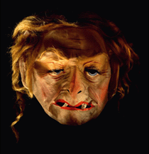 Monster mask, circa 1940, of waxed buckram with hemp hair.