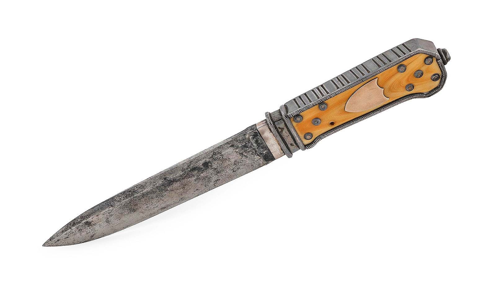 Day one was led by this silver- and gold-mounted presentation gentleman’s bowie knife by Michael Price, 10½ inches long, believed to have descended from a Mr Gibson of Nashua, N.H., who was a California gold rush miner. It sliced down a $63,000 finish ($5/10,000).