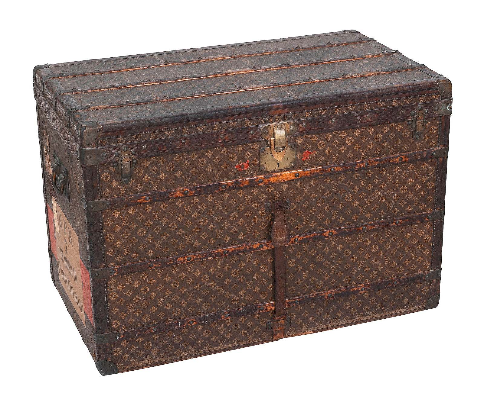 Adorned with the “LV” monogram and bearing a tan label with “RFR 7 In Bond To Providence” stenciled in black, this Louis Vuitton steamer trunk closed shut for $11,340 ($3/5,000).