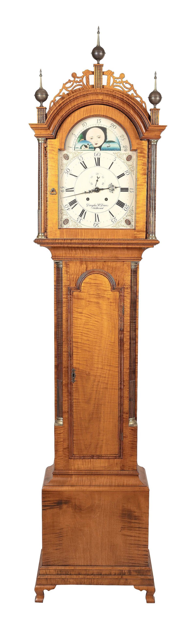 Slightly less than half of the lots offered on day two were in the furniture category, including several pieces by Eldred Wheeler, which earned top prices. A tiger maple desk with a central long drawer and pedestals with paneled sides ($7,560), a tiger maple king-sized canopy bed ($5,355) and a tiger maple bonnet-top secretary in two parts ($5,040), all by Wheeler, found new homes.