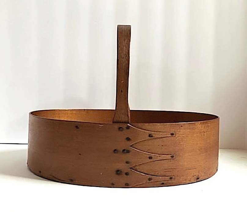 David and Cheryl Craig Antiques offered this circa 1840 New Hampshire shaker oval fingered carrier, made with a maple band, ash handle and pine bottom. Indianapolis.