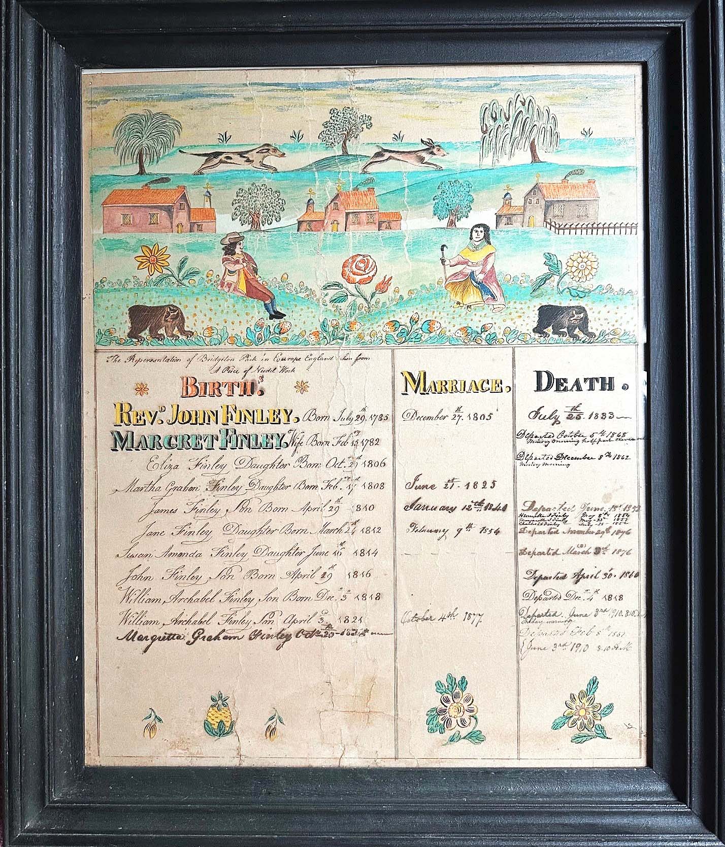 A few of the items the McArdles offered — which were still available at press time — included an 1843 watercolor painted by “H.A. Urmston” of the Patapsco Girl’s School. Identified by her initials alone, as well as “P.F. Inst. Md. 1843,” the McArdles were able to potentially identify the painter as Hannah Ann Urmston, born 1814, who may have been an instructor at the school. Debbie also highlighted a watercolor and ink record of the family of Reverend John Finley of Philadelphia and a three-finger oval shaker box with copper tacks and provenance to the family of the 25th governor of Vermont, Hiland Hill, as other objects of note.