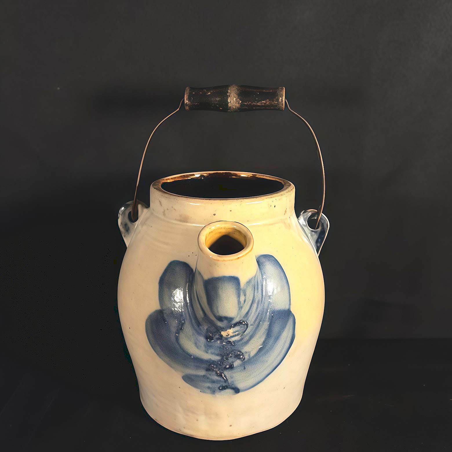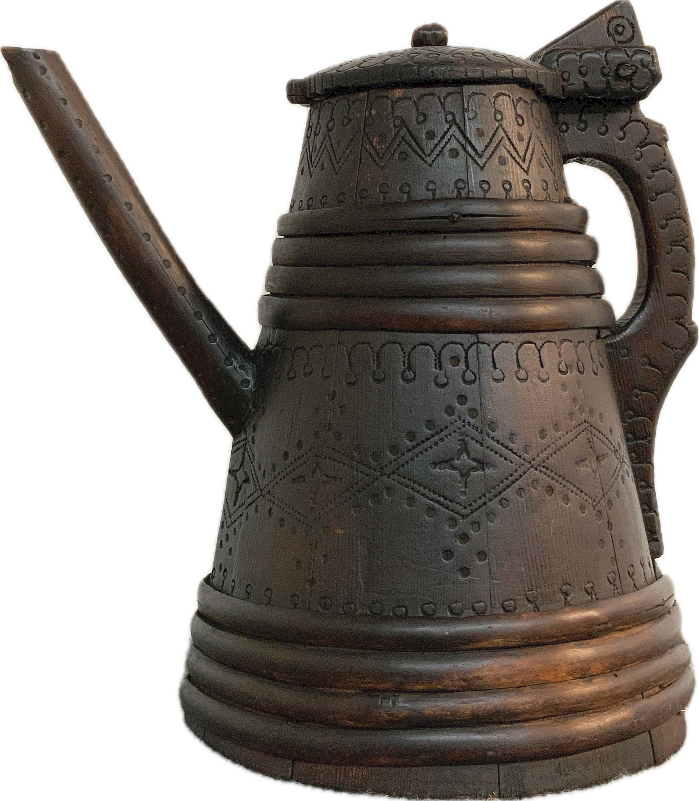One of four items that sold in the booth of Michael Pheffer, Two Sides of a Road Antiques, was this Norwegian staved and decorated ale pitcher. New London, N.H.
