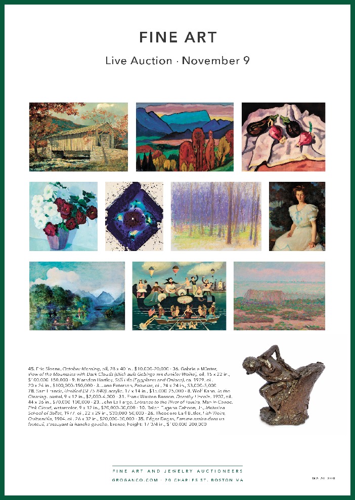 45. Eric Sloane, October Morning, oil, 28 x 40 in., $10,000-20,000 36. Gabriele Munter, View of the Mountains with Dark Clouds (Blick aufs Gebirge mit dunkler Wolke), oil, 15 x 22 in., $ 100,000-1 50,000 9. Marsden Hartley, Still Life (Eggplants and Onions), ca. 1929, oil, 20 x 24 in., $100,000-150,000 3. Jane Peterson, Petunias, oil, 24 x 24 in., $3,000-5,000 78. Sam Francis, Untitled (SF75-840), acrylic, 17×14 in., $ 15,000-25,000 8. Wolf Kahn, To the Clearing, pastel, 9×12 in., $2,000-4,000 • 31. Frank Weston Benson, Dorothy Lincoln, 1907, oil, 44 x 36 in., $70,000-100,000 23. John La Farge, Entrance to the River of Tautira, Man in Canoe, Pink Cloud, watercolor, 9 x 12 in., $20,000-30,000 10. Ralph Eugene Cahoon, Jr., Melusina School of Ballet, 1977, oil, 22 x 29 in., $30,000-50,000 26. Theodore Earl Butler, Fish Weirs, Quiberville, 1904, oil, 26 x 32 in., $20,000-30,000 35. Edgar Degas, Femme assise dans un fauteuil, s’essuyant la hanche gauche, bronze, height: 17 3/4 in., $100,000-200,000