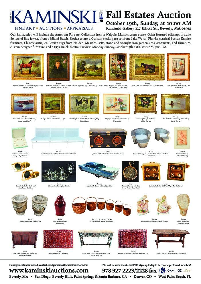Our Fall auction will include the American Fine Art Collection from a Walpole, Massachusetts estate. Other featured offerings include 80 lots of fine jewelry from a Miami Beach, Florida estate, a Gorham sterling tea set from Lake Worth, Florida, classical Boston Empire furniture, Chinese antiques, Persian rugs from Holden, Massachusetts, stone and wrought iron garden urns, ornaments, and furniture, custom designer furniture, and a 1959 Buick Electra. Preview: Monday-Sunday, October 13th-19th, 9:00 AM-5:00 PM.