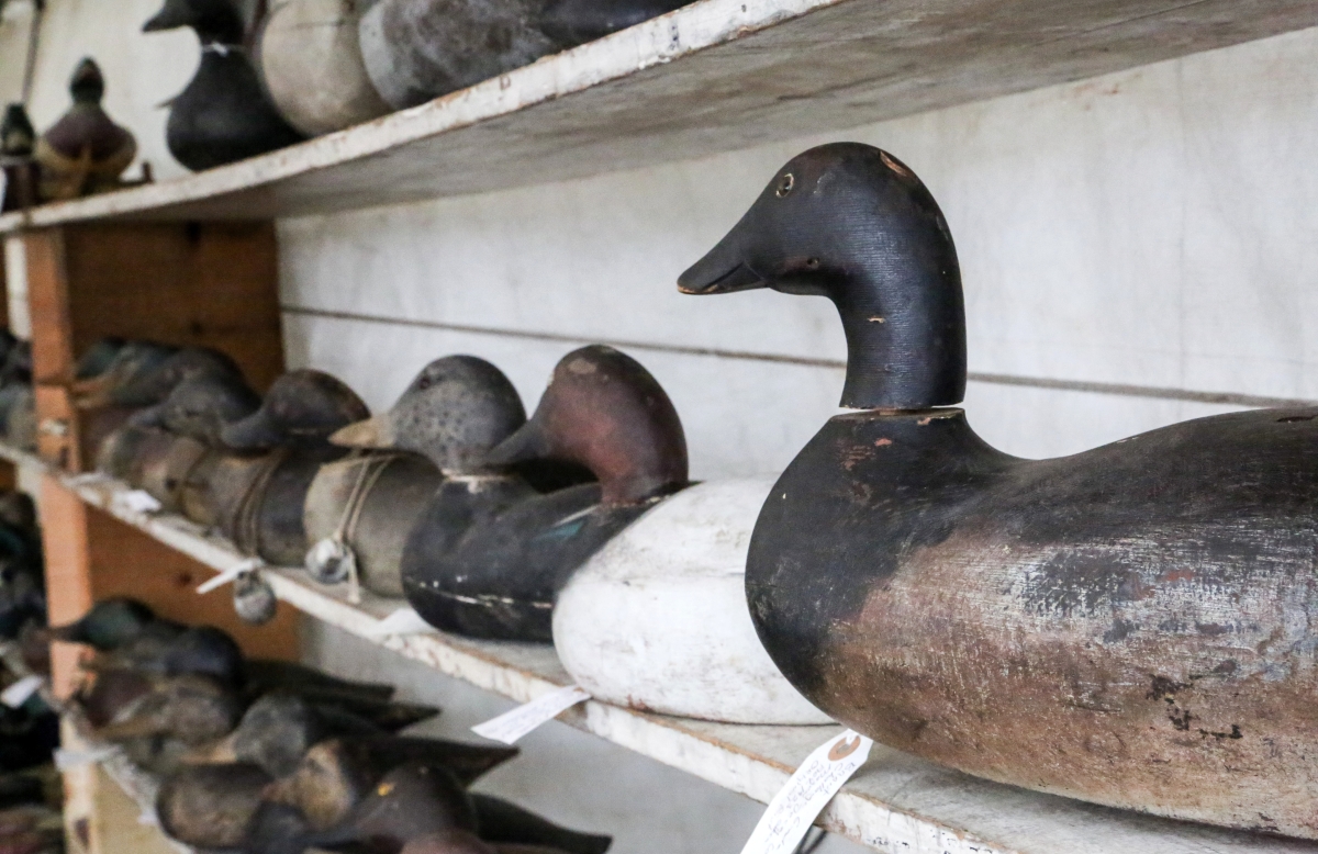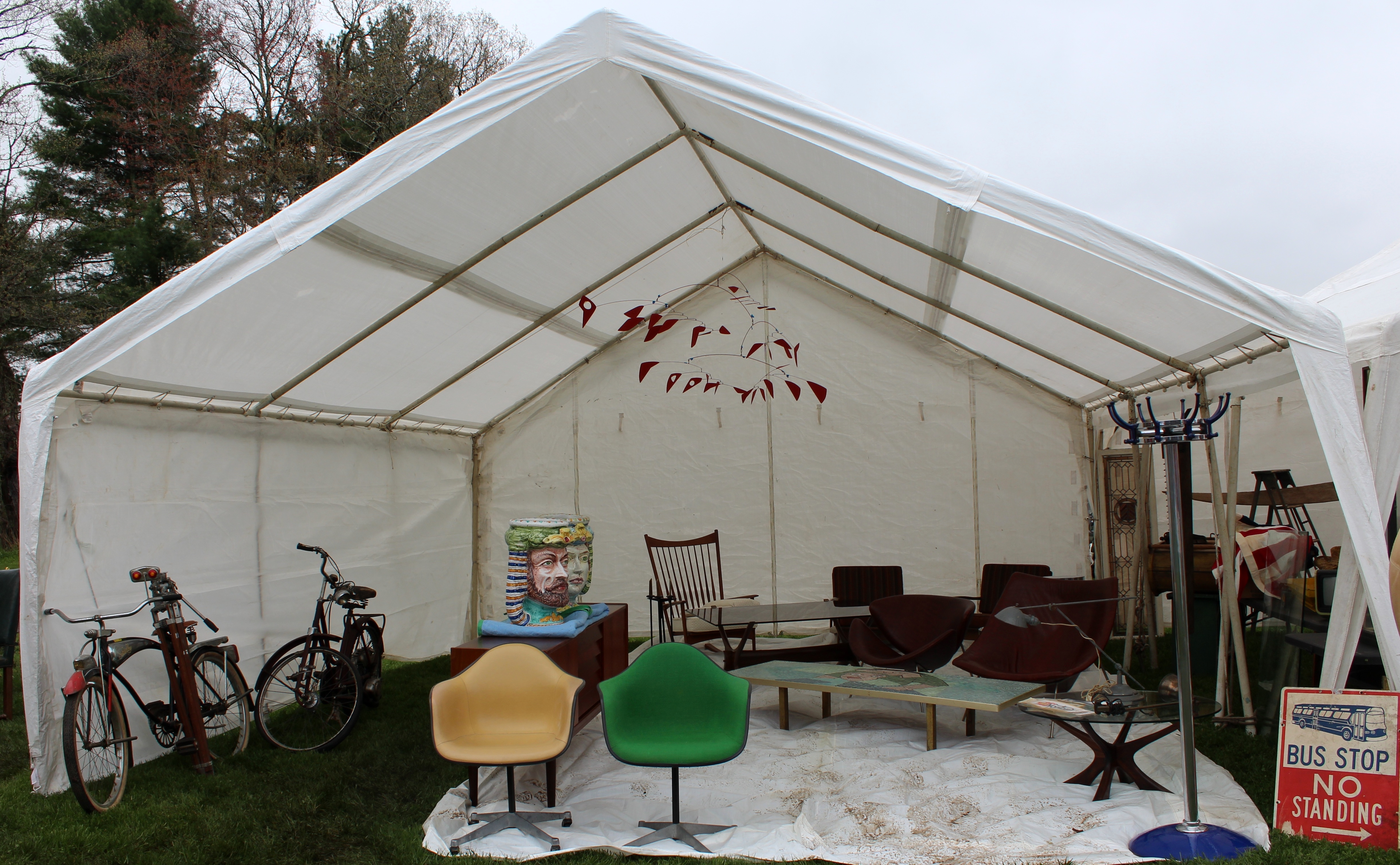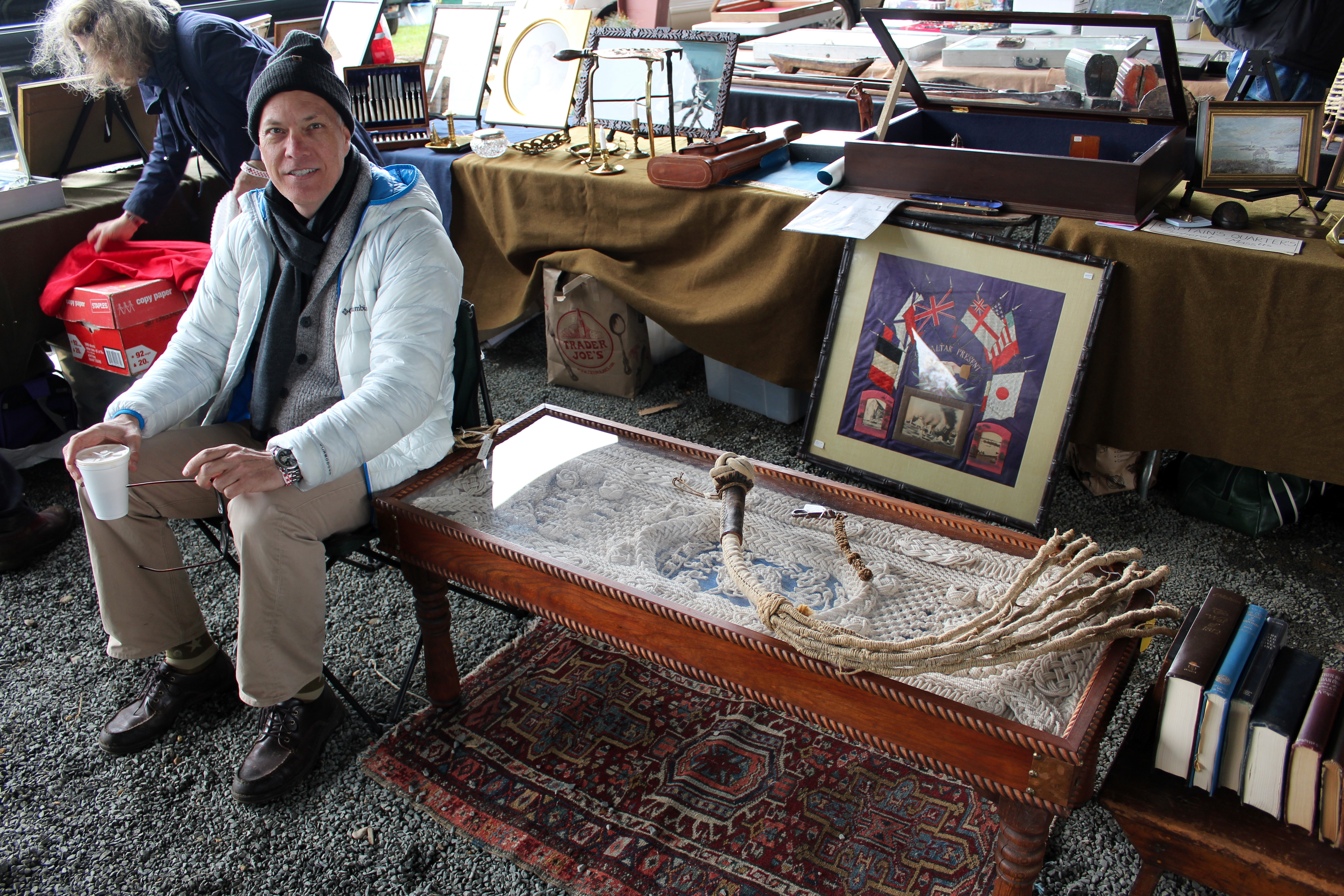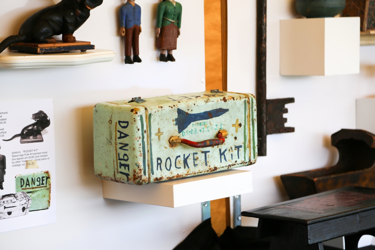 One of the largest tents in Midway is shared by Ross Brothers, James H. LeFurgy and David Erickson, all of whom have been doing the show for decades, and the atmosphere in the tent is one of jovial camaraderie. Ross Brothers, Florence, Mass., had boats and canoes, antiques, architectural salvage and “other unusual items,” a handy catch-all phrase that covers the rest of the bases, including a vintage Jeep that was sitting in front of the tent, just off the road. Lefurgy, Wiscasset, Maine, ticked off a variety of sales he had made in the first few hours of the show: a carved wooden busk, a Pomo basket, a Kachina doll, a painting of Storm King and a miniature blanket chest.