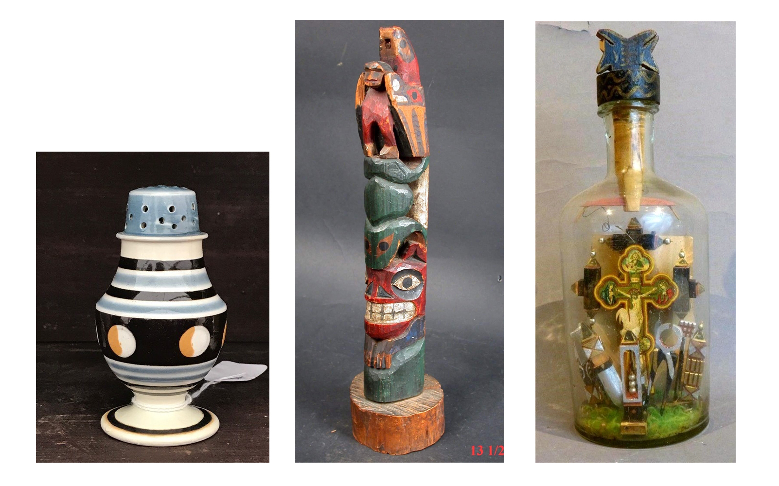 STOLEN: Three objects were reported stolen to Antiques and the Arts Weekly. The mochaware pepper pot in blue, black, orange and white was stolen from Charlie Guinipero, trading as Pantry Box Antiques from Stafford Springs, Conn., at Hertan’s. With any information, contact him at 860-716-8860. Two objects, a European bottle whimsy and a a Northwest Coast carved totem, were stolen from Akron, Ohio, dealer Darwin Bearley, who was set up at Heart-O-The-Mart. With any information, contact him at 330-376-4965.