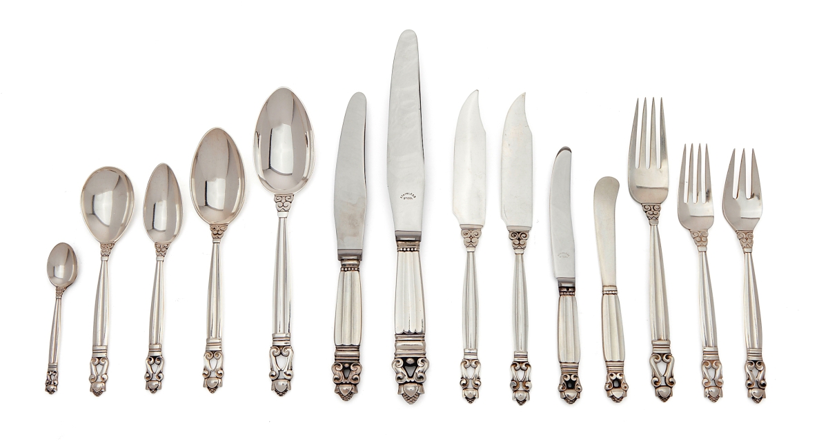 The glitter of sterling silver was reflected in a large offering of Georg Jensen pieces, as well as designs by Gorham, Tiffany & Co., and Kirk & Son Co. A Georg Jensen Acorn pattern silver flatware service brought $13,750, while a Gorham Martelé center bowl sold for $10,000.
