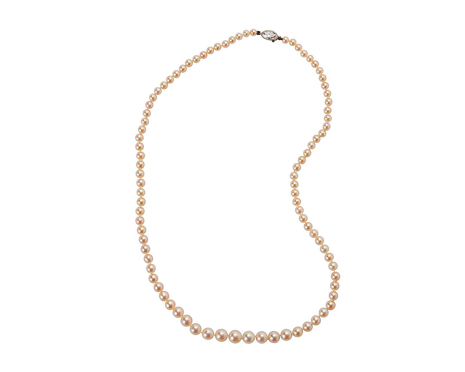 A Tiffany & Co., pearl necklace with a diamond set into its platinum clasp sold with its two original boxes for $34,375, more than doubling its high estimate. Winthrop remarked that this was one of the best sets of pearls she had ever handled, noting their “beautiful color with creamy pinky undertones” and the fact that they were natural pearls, not cultured. She exhibited the fineness of this necklace, comparing it to another strand of natural pearls in the same auction, saying, “This one was so luscious and beautiful and superior. Bidders recognized that. Plus, it had all the extras you could hope for, including the Tiffany signature and original box.”