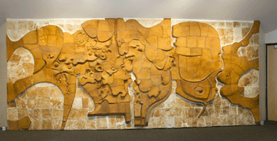 In the 1950s, Wildenhain became increasingly interested in the associations between ceramic walls and architecture, believing that artist and architect should collaborate early in the design process. He was awarded a 1958 Guggenheim Fellowship to study the matter. Eventually, the intrigue in murals became a regular part of his professional endeavors. In addition to the National Library of Medicine mural, Wildenhain’s most notable examples of wallscapes stand at Overlook Hospital, Summit, N.J.; Ingle Auditorium, RIT; and Sloan Fine Arts Center, Lock Haven University, Lock Haven, Penn.