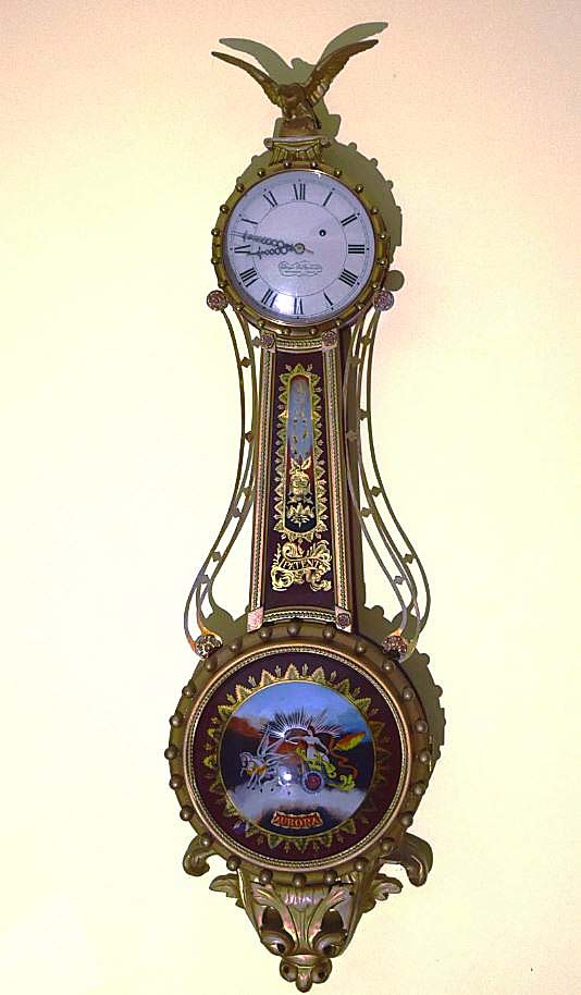 A similar label was inside a shelf clock made by Colonial Williamsburg and modeled after one made by Eli Terry, Sr (1772-1852), in Colonial Williamsburg’s collection. A reverse painted panel, brass finials and burl wood inlays embellished the clock, which traded hands for $6,250, more than six times its high estimate. Elmer O. Stennes’ (1911-1975) eglomise girandole banjo clock timed out at $3,500.