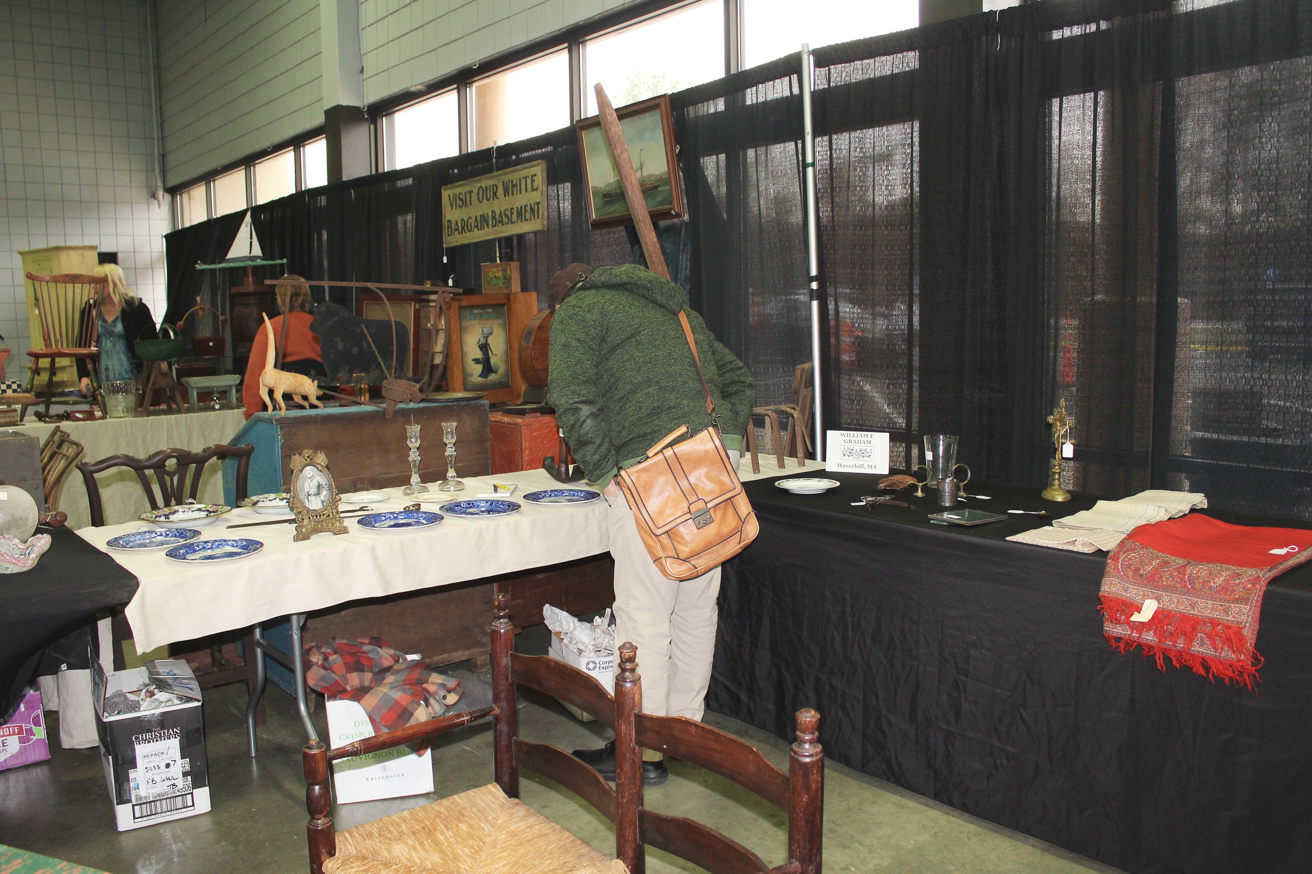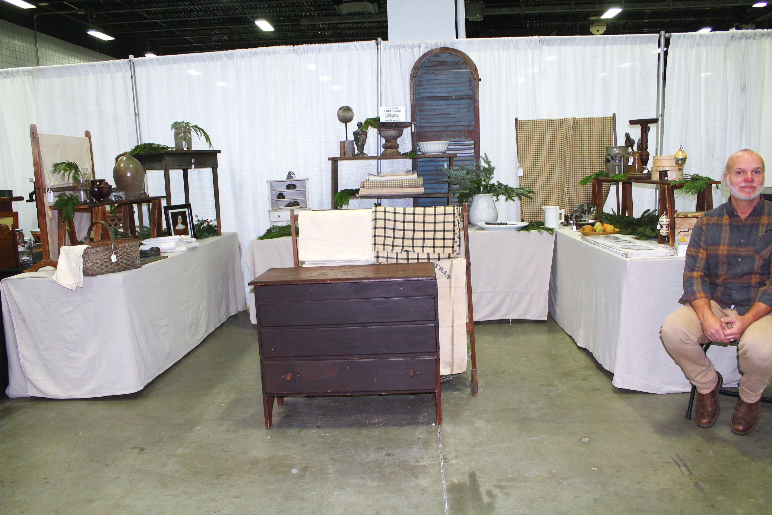“We love this show,” Tom Jewett told us. “People linger all day long, it’s great.” He and Butch Berdan noted quite a few sales, “mostly holiday,including Santas, Belsnickels, a Halloween pumpkin and a large oval Shaker pantry box.”