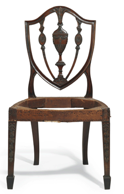 Prickett also purchased an inlaid Pembroke table attributed to William Whitehead of New York for $194,500; a Pennsylvania bonnet-top spice cabinet, probably from Montgomery County, for $182,500; and a Federal shield back side chair with crisp carvings attributed to Samuel McIntire for $662,500. The record-setting chair is from a set of eight made for Elias Hasket Derby and his wife, Elizabeth Crowninshield, of Salem, Mass. Four chairs from the set belong to the Museum of Fine Arts, Boston. A fifth is at Winterthur.