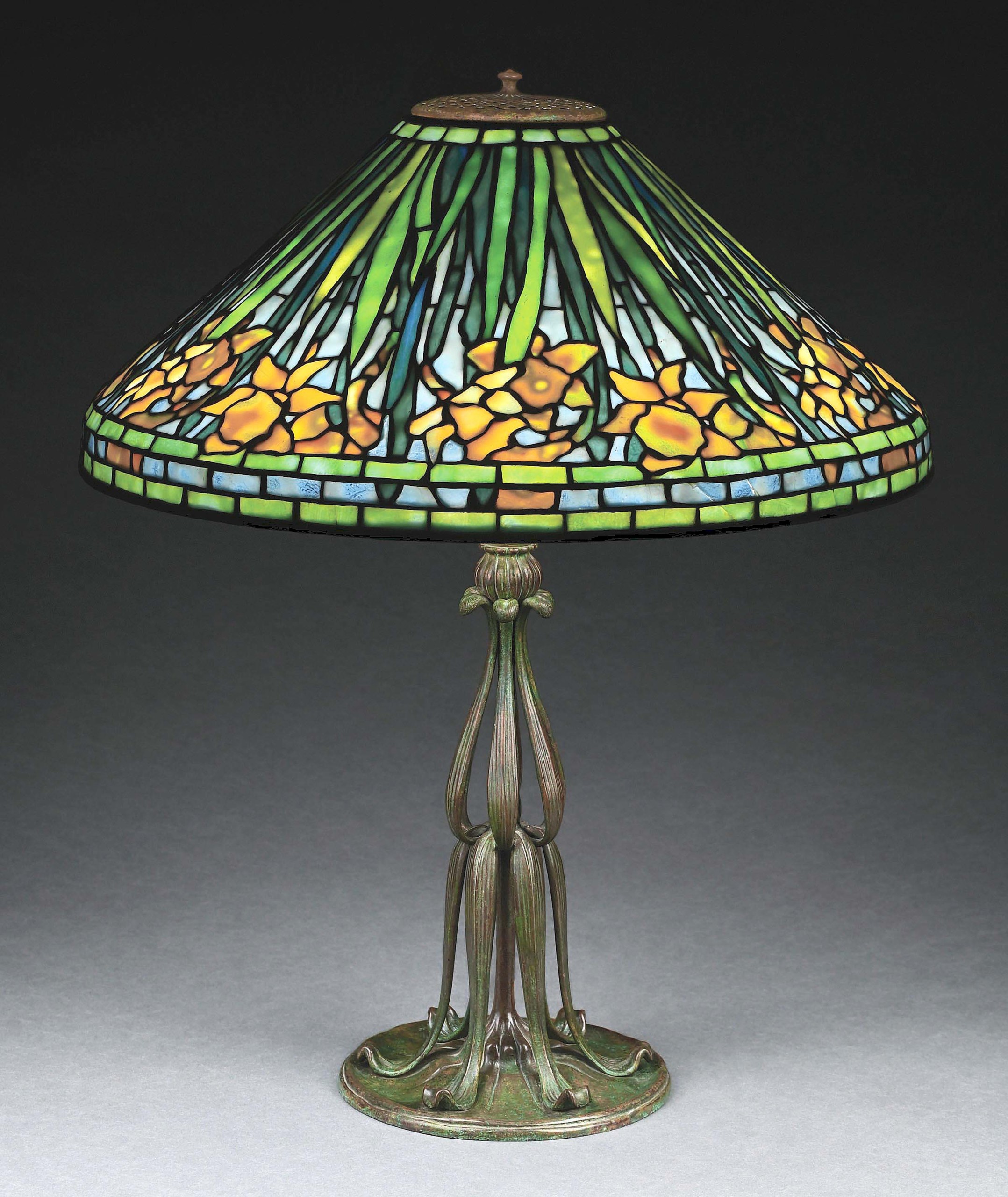This Tiffany Studios table lamp with a 20-inch leaded-glass Daffodil shade on a bronze Ribbon base, 25 inches tall, earned top-lot honors, selling for $73,800 ($50/70,000).