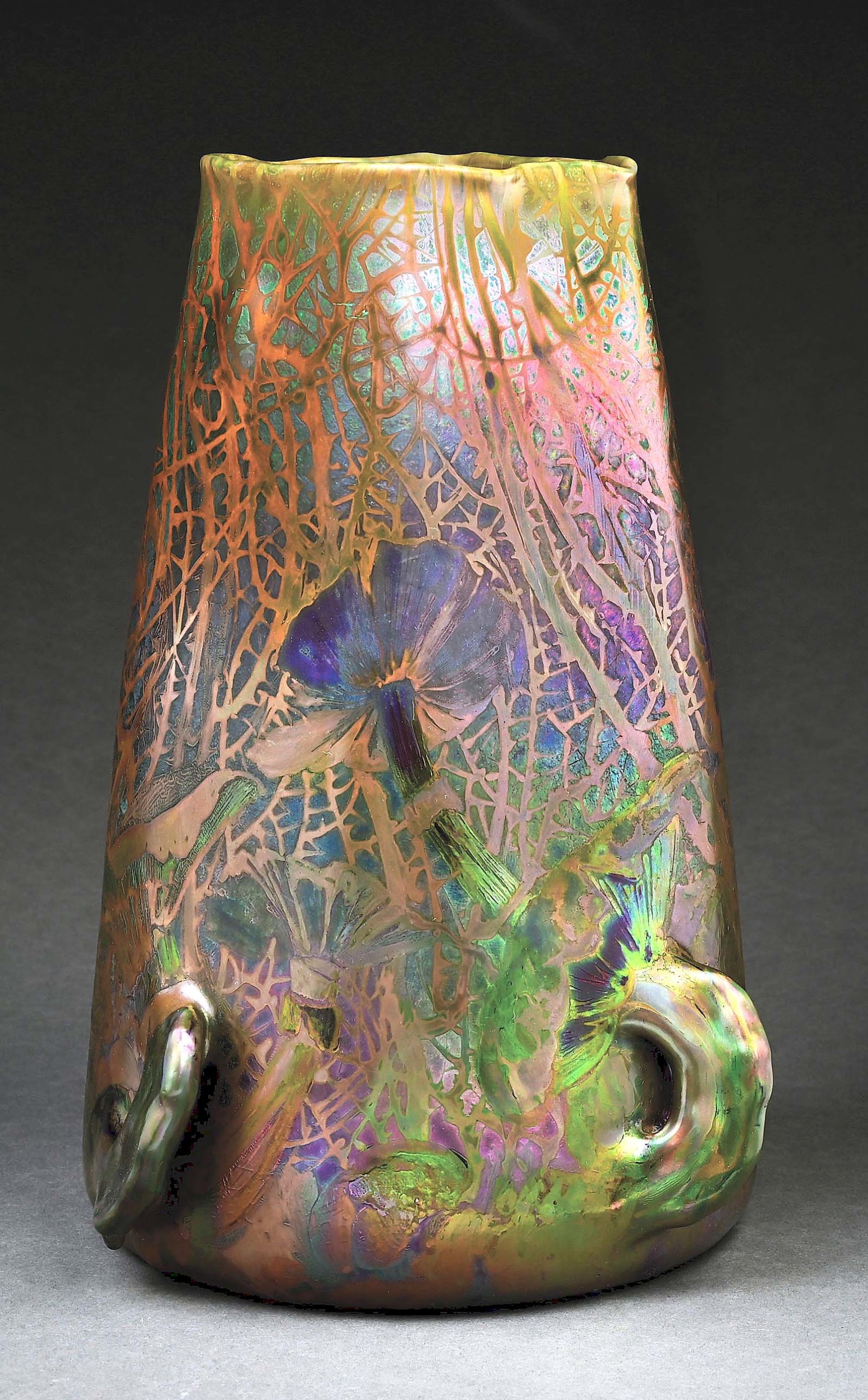 Surpassing its high estimate by nearly 180 percent, an iridized Mushroom vase designed by Lucien Lévy-Dhurmer and executed by Clément Massier in Golfe-Juan, France, topped off at $41,820. The vase stood 14 inches tall and featured protruding mushroom stems around the base with iridescent caps detailed on the vase’s surface. The circa 1900 piece was both signed in slip and impressed for Massier on its underside.
