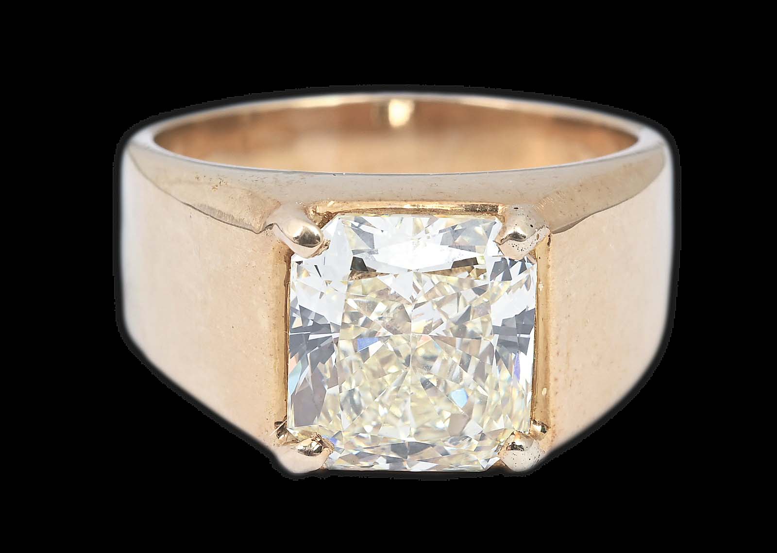 If fancy yellow diamond rings were what you sought, this auction had another option. This one, a ladies’ ring in 18K white and yellow gold had a central 3.05-carat cushion-cut yellow diamond surrounded by 28 round yellow diamonds (0.14 carats) and further accented by 94 colorless round brilliant diamonds (0.55 carats). It was bid to $29,520.