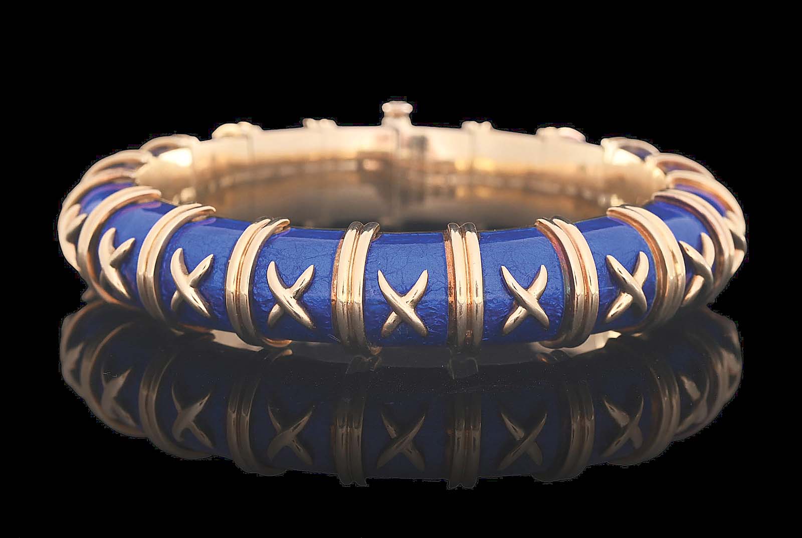 The Tiffany family was not represented solely by lighting: several lots of Tiffany Studios desk articles, a Tiffany Studios tea screen and nine lots of silver and gold fashions from Tiffany & Company also crossed the block. Designed by Jean Schlumberger for Tiffany & Company, an 18K yellow gold Croisillon X bracelet with blue paillonné enamel sold, with its original marked “Tiffany & Co. / New York” box, for $36,900. In very good to excellent condition, just one of the panels had minor touch ups to the enamel, and bidders pushed it close to its high estimate.