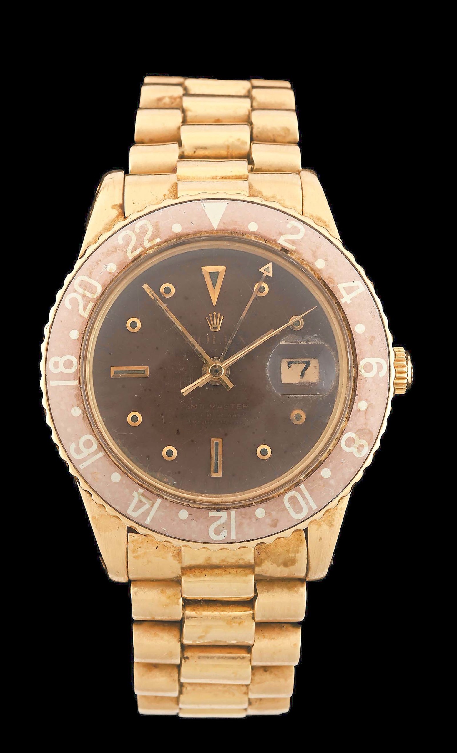 With a brown dial, this men’s Rolex Oyster Perpetual GMT Master in 18K gold was bid to $29,520, despite some condition issues ($6/9,000).