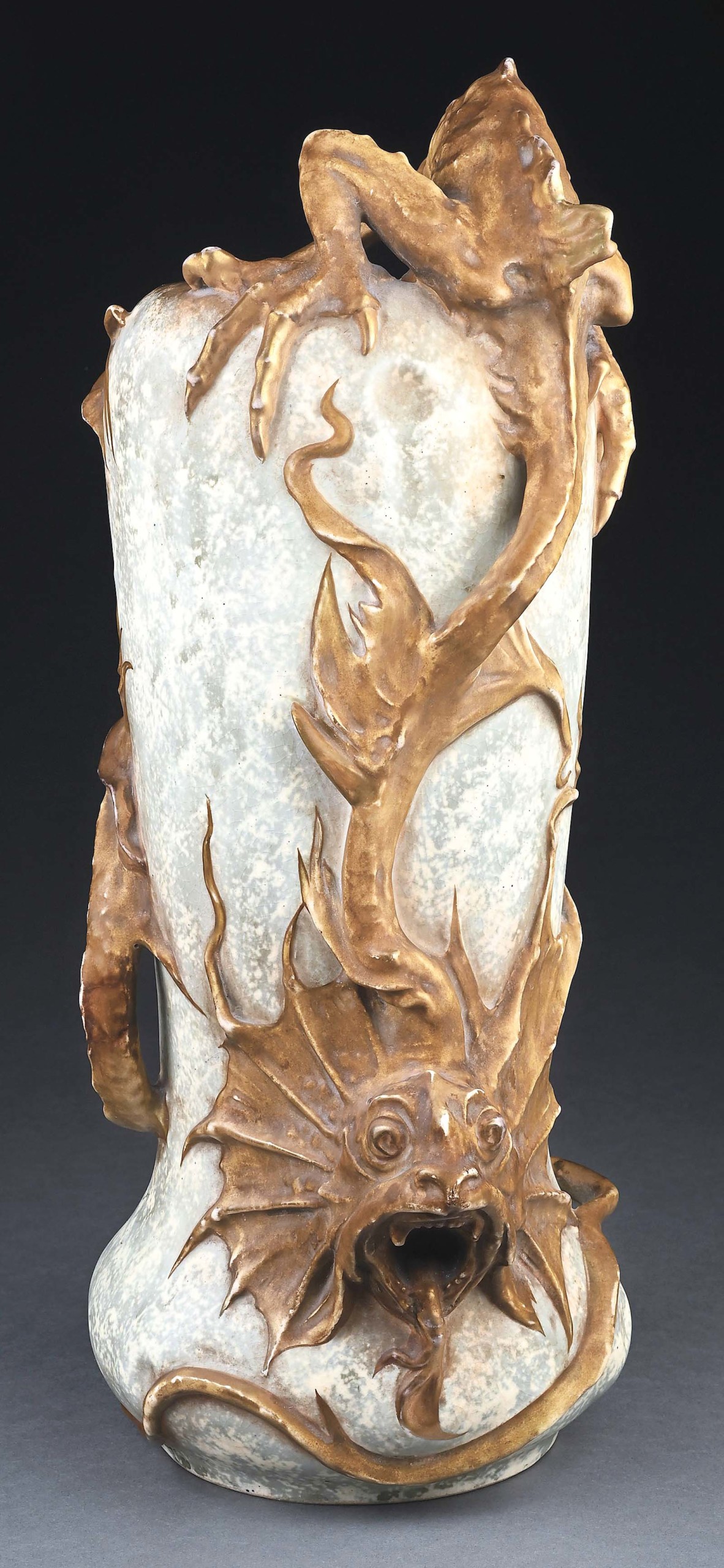 This Amphora glazed hard-earthenware Humpback Dragon vase, designed by Eduard Stellmacher, Austria, circa 1901, 20¼ inches tall, found a new lair for $16,380 ($12/18,000).