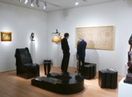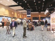 It’s a family affair for some artists. Tracy Hambley of Southbury, Conn., was not feeling well on Saturday morning so she set up with the intention of heading home and letting husband James Carter helm the booth. Hambley is an assemblages artist using found, vintage and common objects and combining them into a narrative to tell a story. The pieces are housed under glass in deep wood frames. Prominent in her booth was “Peep Show,” made out of old game boards, a camera lens and parts, dolls eyes, a bisque doll leg and other vintage items. Carter used just one wall to display a few of his own works — super-real still life paintings done in acrylic with airbrush.