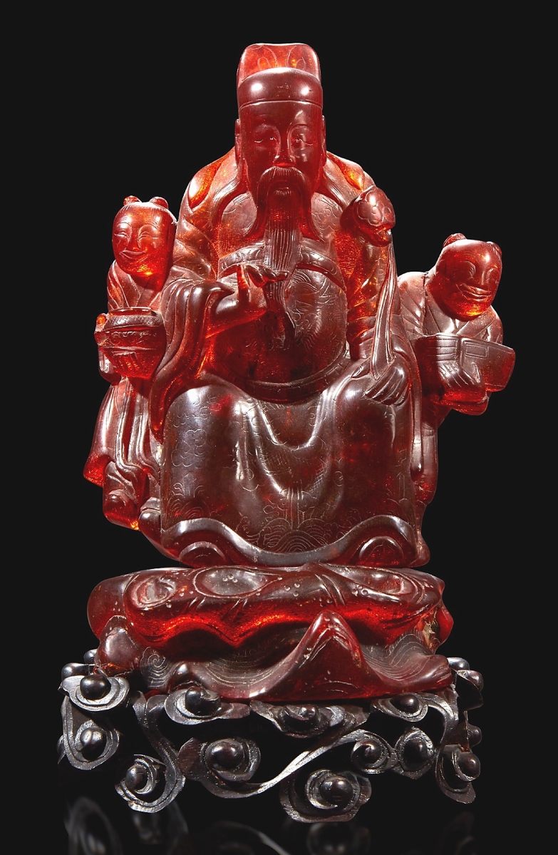 A Chinese carved amber figure of a sage and acolytes was also from the Johnson collection, as was a Chinese carved jadeite meiren. The amber figure of a sage and acolytes sold to an American buyer for $25,200, while an American trade buyer paid $22,680, nearly ten times the low estimate, for the jadeite meiren.
