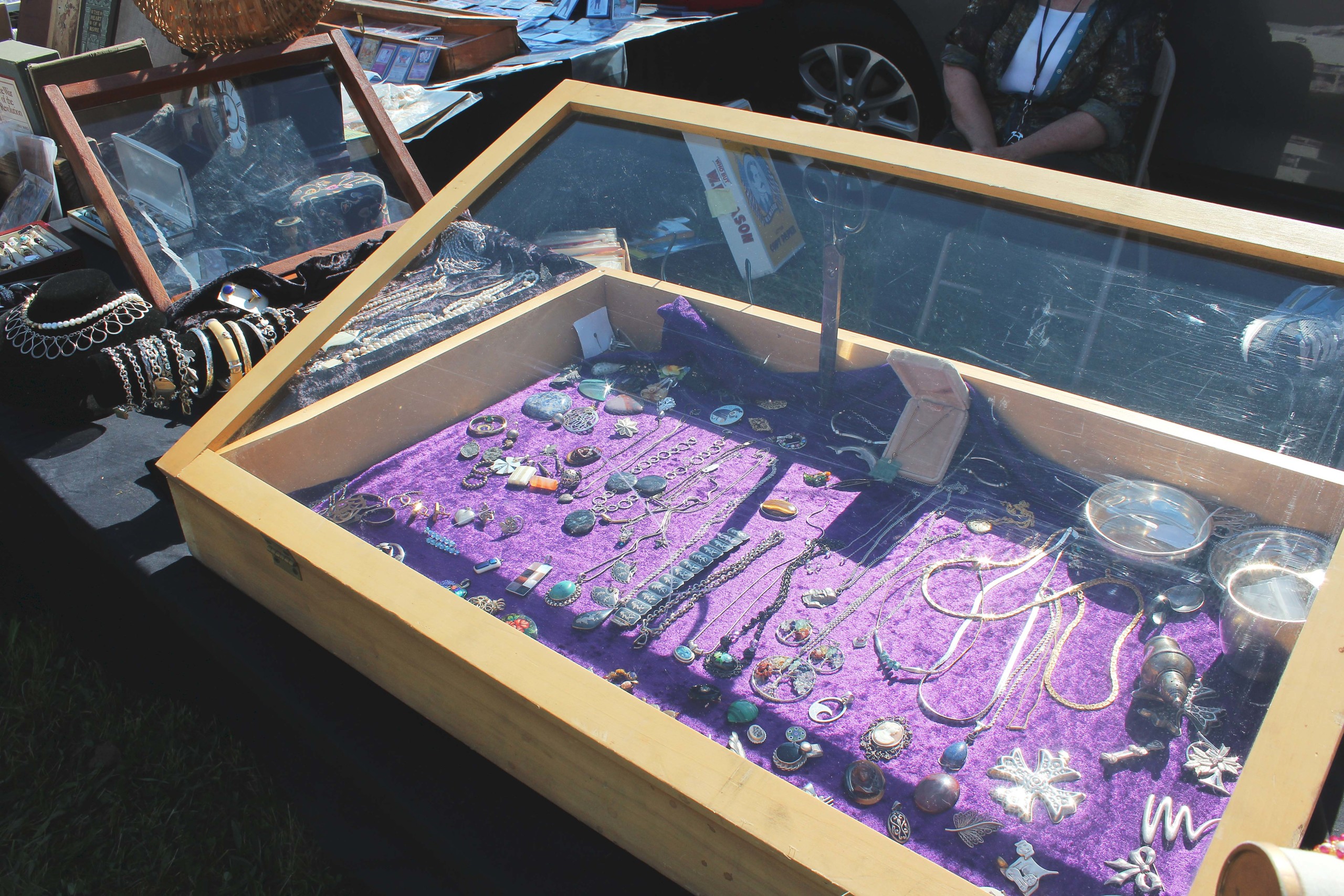 It was hard to miss East Hampton, Conn., dealer Francine Gintoff, who was dressed appropriately for the weather, with a stylish floppy sun hat and glasses. She stood behind one of the main tables in her booth as we approached, making sure some of the estate jewelry she had on display was draped properly upon its stand. “I specialize in Midcentury Modern, but this [show’s booth] is sort of a fun one; it’s a lot of collectibles, and character inspired,” she shared. Said “characters” included a boxed Jack Skellington doll from Disney’s The Nightmare Before Christmas, among other nostalgic toys from the early 2000s and earlier. Gintoff also sported a rack of vintage clothing, several lamps and unique glass and pottery pieces and a few paintings, which were positioned on the grass in front of her two main display tables. When asked where she sourced her eclectic and stylish finds, she said, with a smile, “It’s a secret!”