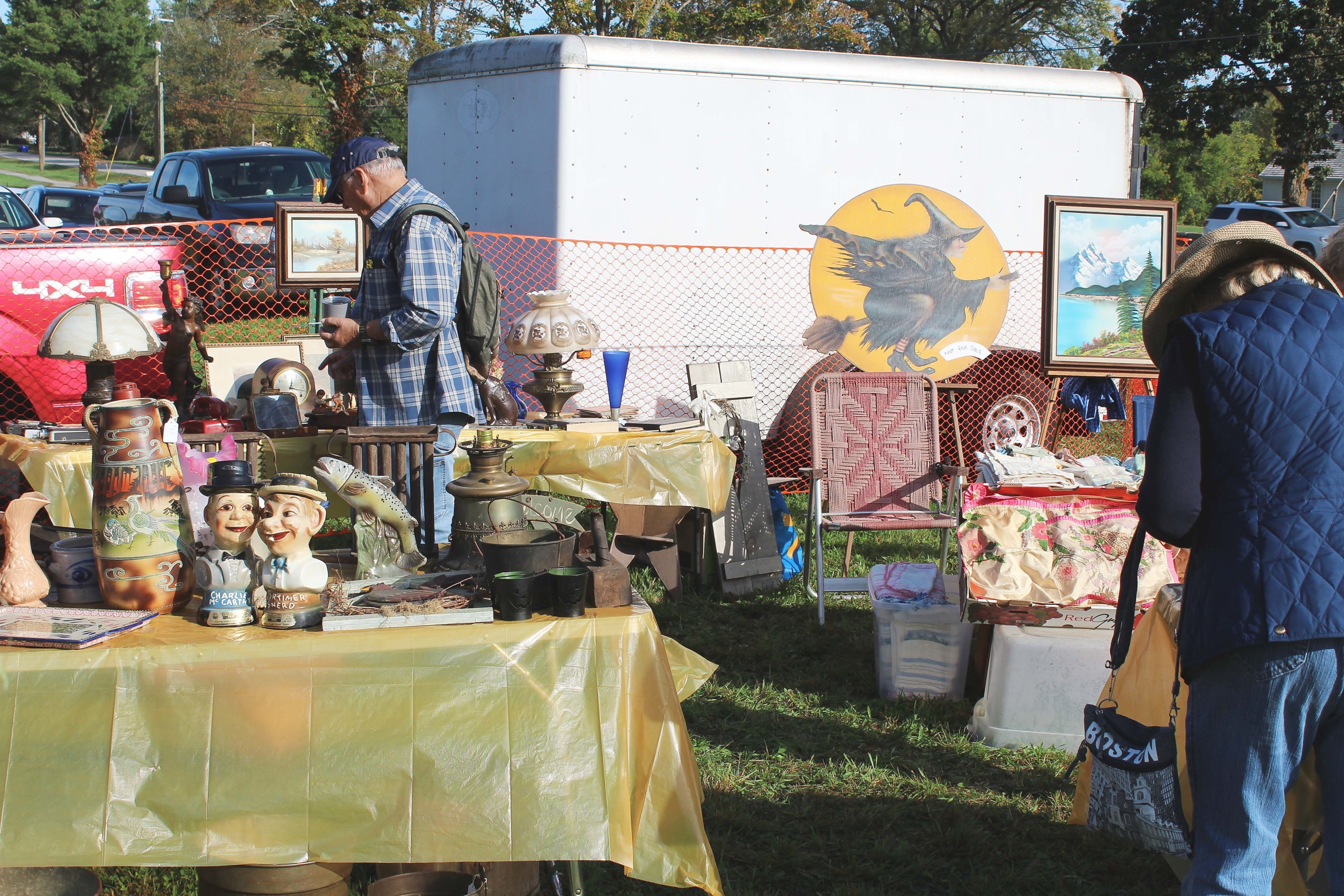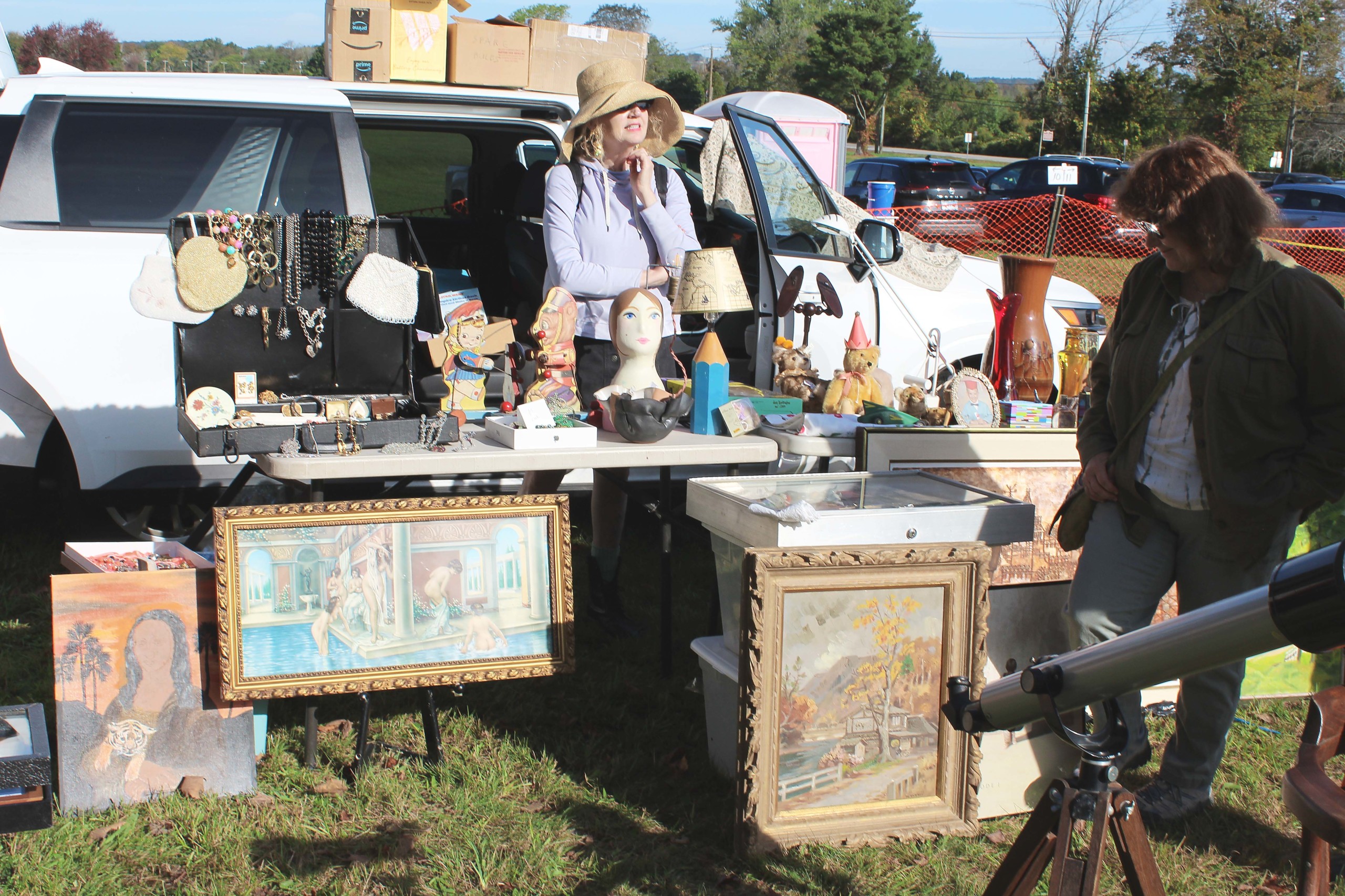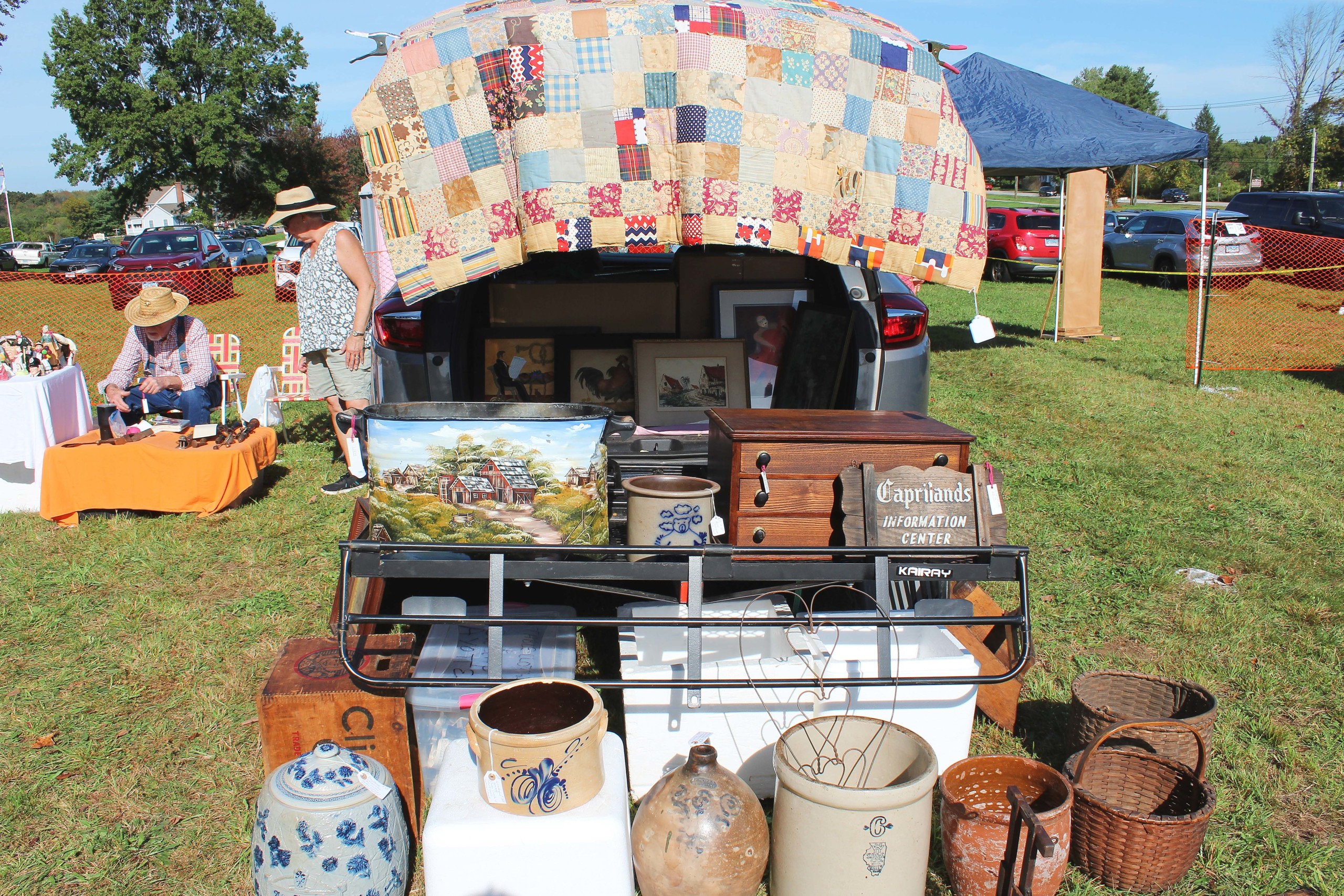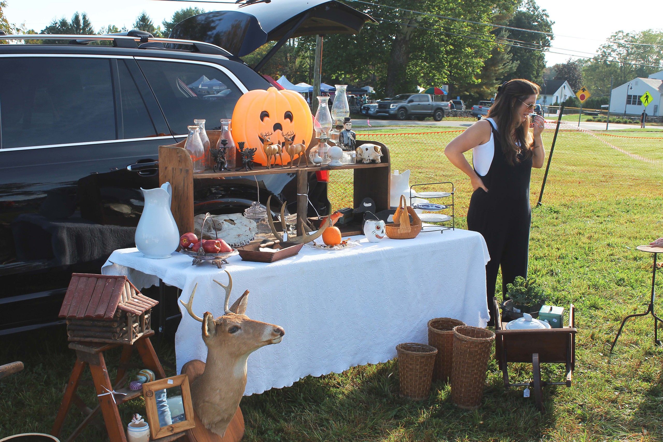 “I have a little bit of country décor, some home décor, outdoor décor… but it’s mostly a mix!” shared Danielle Costa, whose bubbly energy was almost as bright as the morning’s sunshine. Costa, based out of Hebron, Conn., acquires most of her merchandise from estate sales, tag sales and flea markets. “I collect whatever catches my eye!” she added. Her seasonal finds, including a glow mold of a Jack-o-lantern and a taxidermized buck head, went “with the fall weather.” “I also have a set of three baskets with liners; those were a fun find!” As we left Costa’s booth, she was in the middle of making a sale to a customer, who was interested in a pair of stone flowerpots.