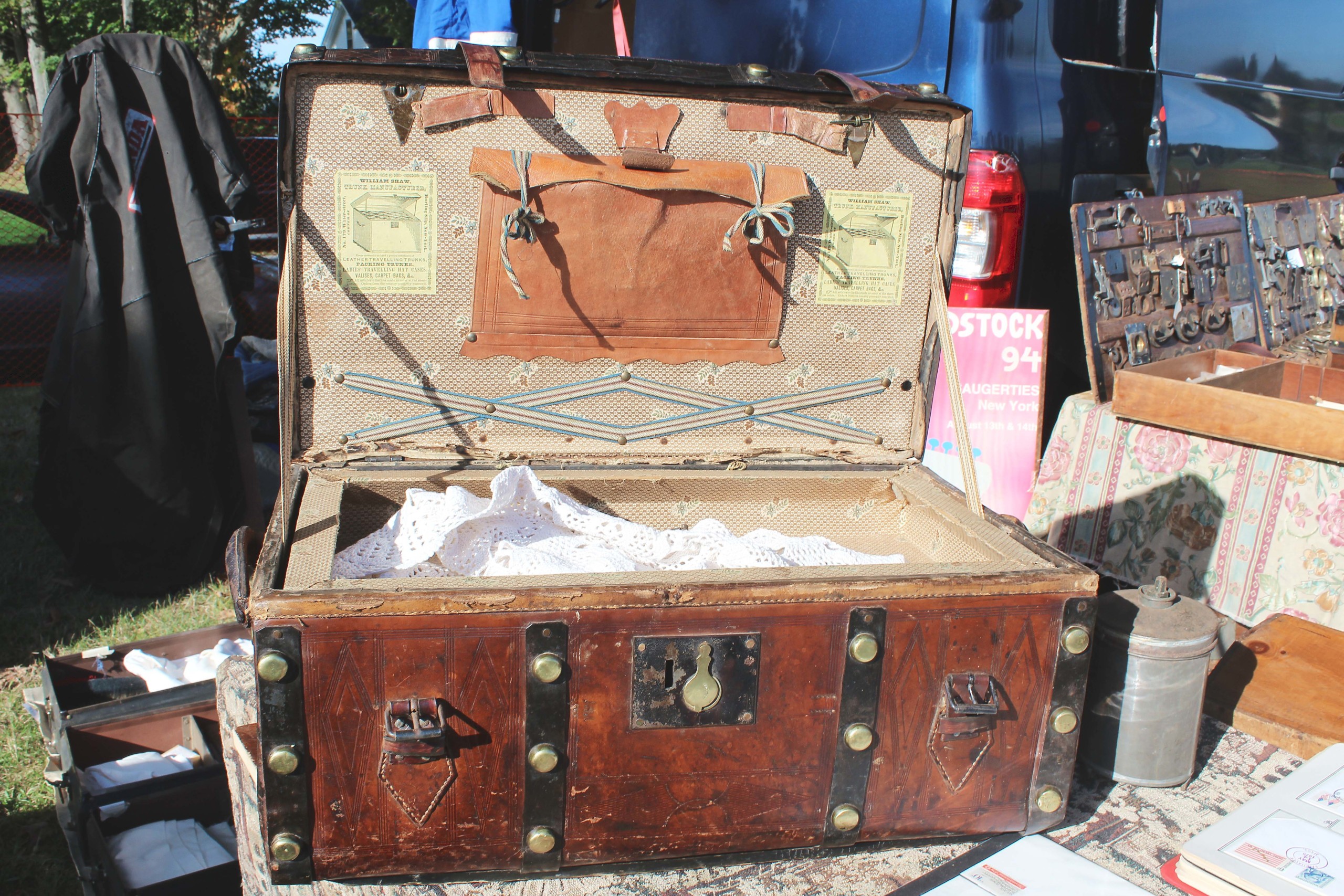 This sample trunk from the 1930s was made in Burling Slip, Manhattan, had a double label and was marked with an early patent, as well as “CT” for Connecticut and the initials of the original owner. One of many interesting trunks found in the booth of tradesman and dealer Paul Norton, Terryville, Conn.